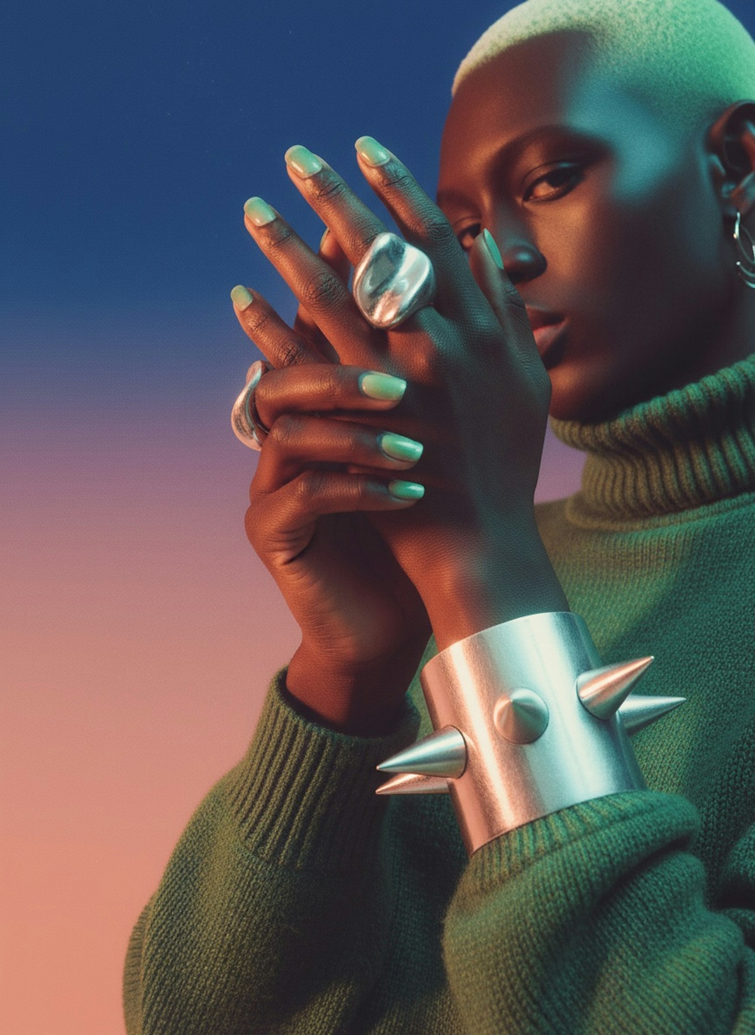 A bold portrait of a person with striking accessories and a gradient background, showcasing a modern and artistic aesthetic.