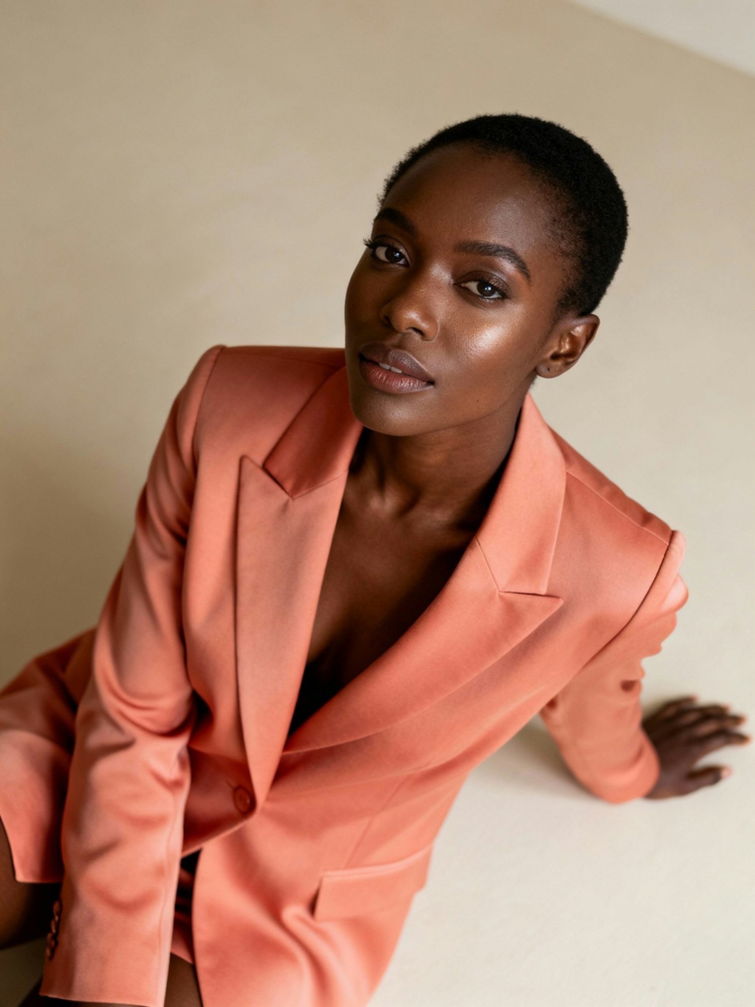 High-definition portrait of a stylish Black woman wearing a soft coral blazer that complements her glowing skin. She poses with calm confidence against a neutral, minimalist backdrop, allowing the warm coral tones to stand out. Soft, even lighting highlights her natural beauty, refined features, and the smooth texture of the blazer. The mood is elegant, modern, and effortlessly sophisticated—perfect for a fashion editorial or beauty-focused portrait.