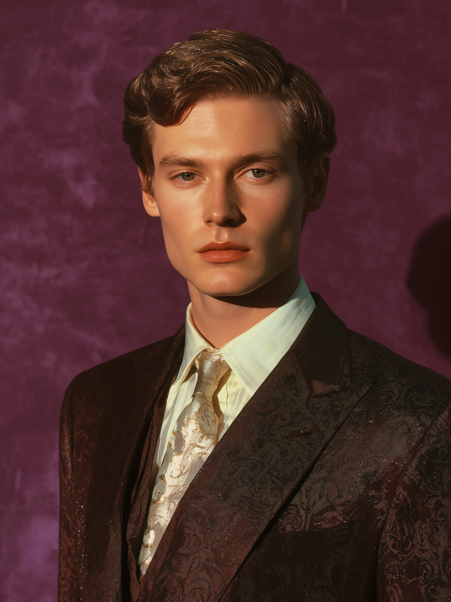 A young man in a patterned brown suit and yellow shirt poses against a purple background, showcasing a refined and elegant style.
