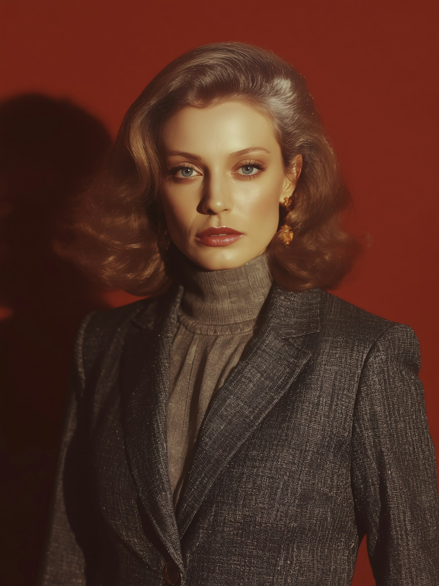 Elegant woman in a textured blazer against a warm red background, showcasing a classic and sophisticated style.
