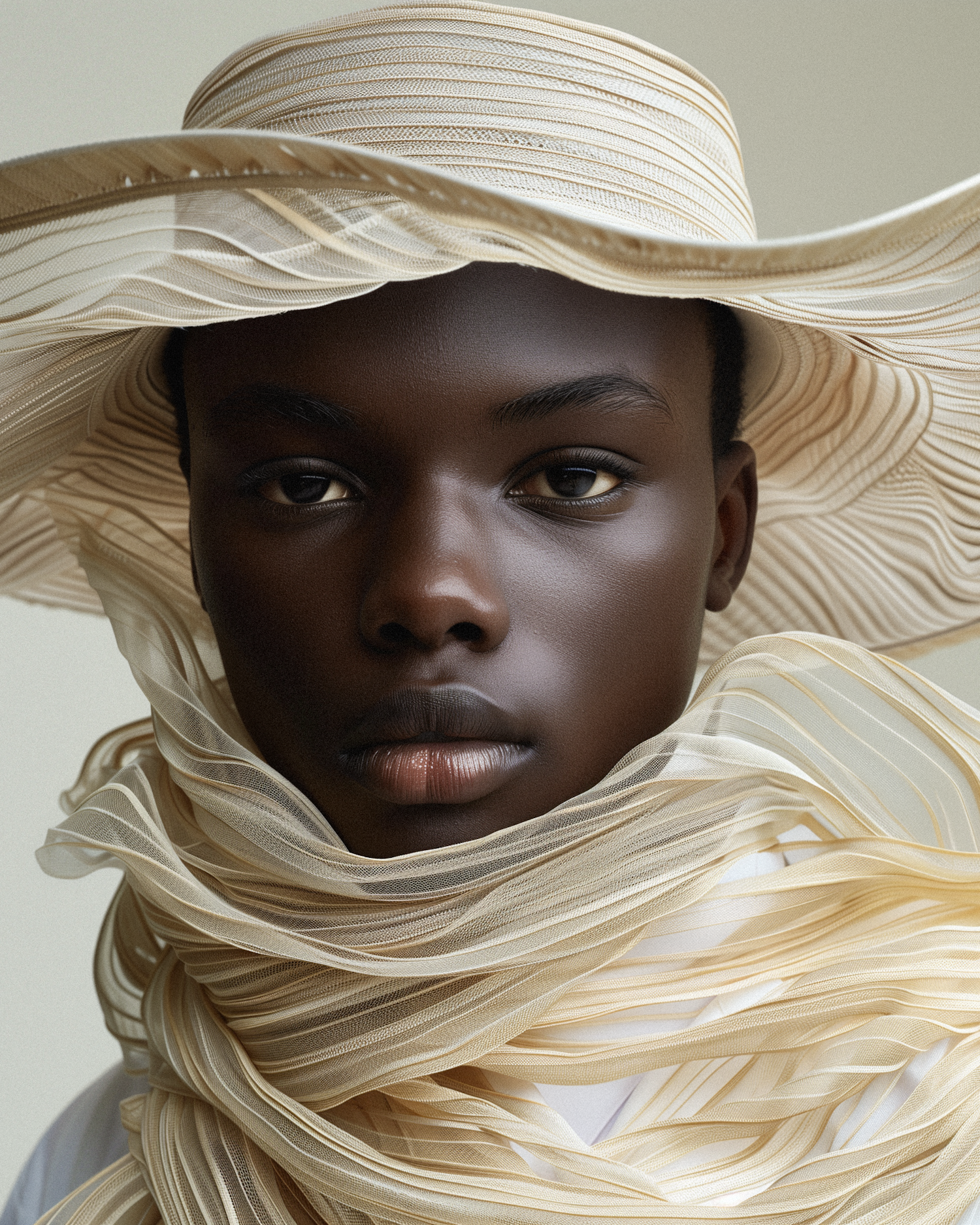 Elegant portrait of a person in a wide-brimmed hat and flowing scarf, showcasing a serene expression and harmonious colors.