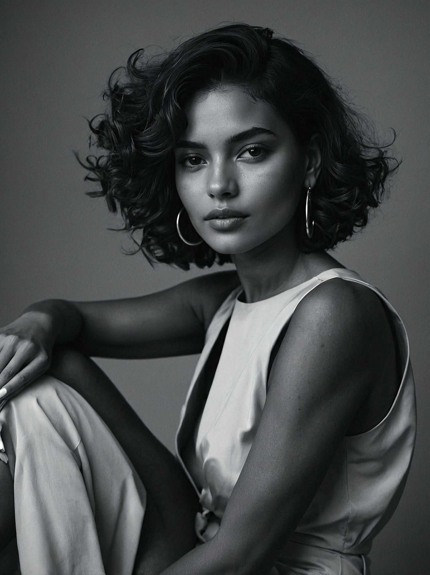 Black and white portrait of a woman with curly hair, hoop earrings, and a confident gaze, exuding elegance and timeless beauty.