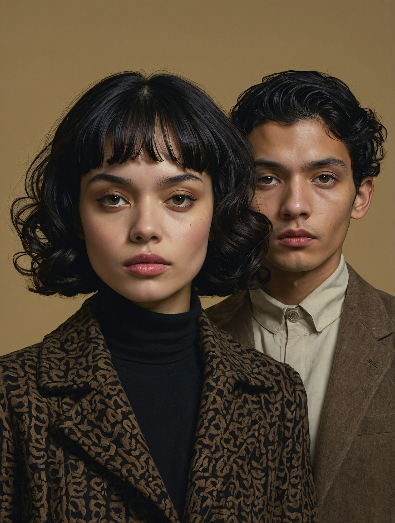 Stylish young couple in coordinated brown outfits against a beige background, exuding modern elegance and unity.