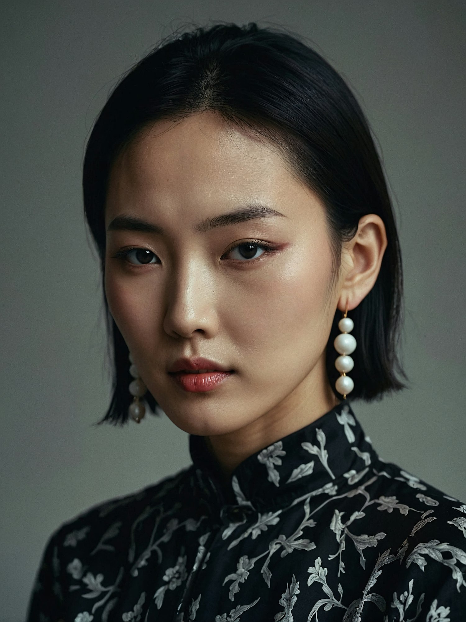 Elegant Asian woman in black floral attire with pearl earrings, showcasing sophisticated style against a muted gray background.