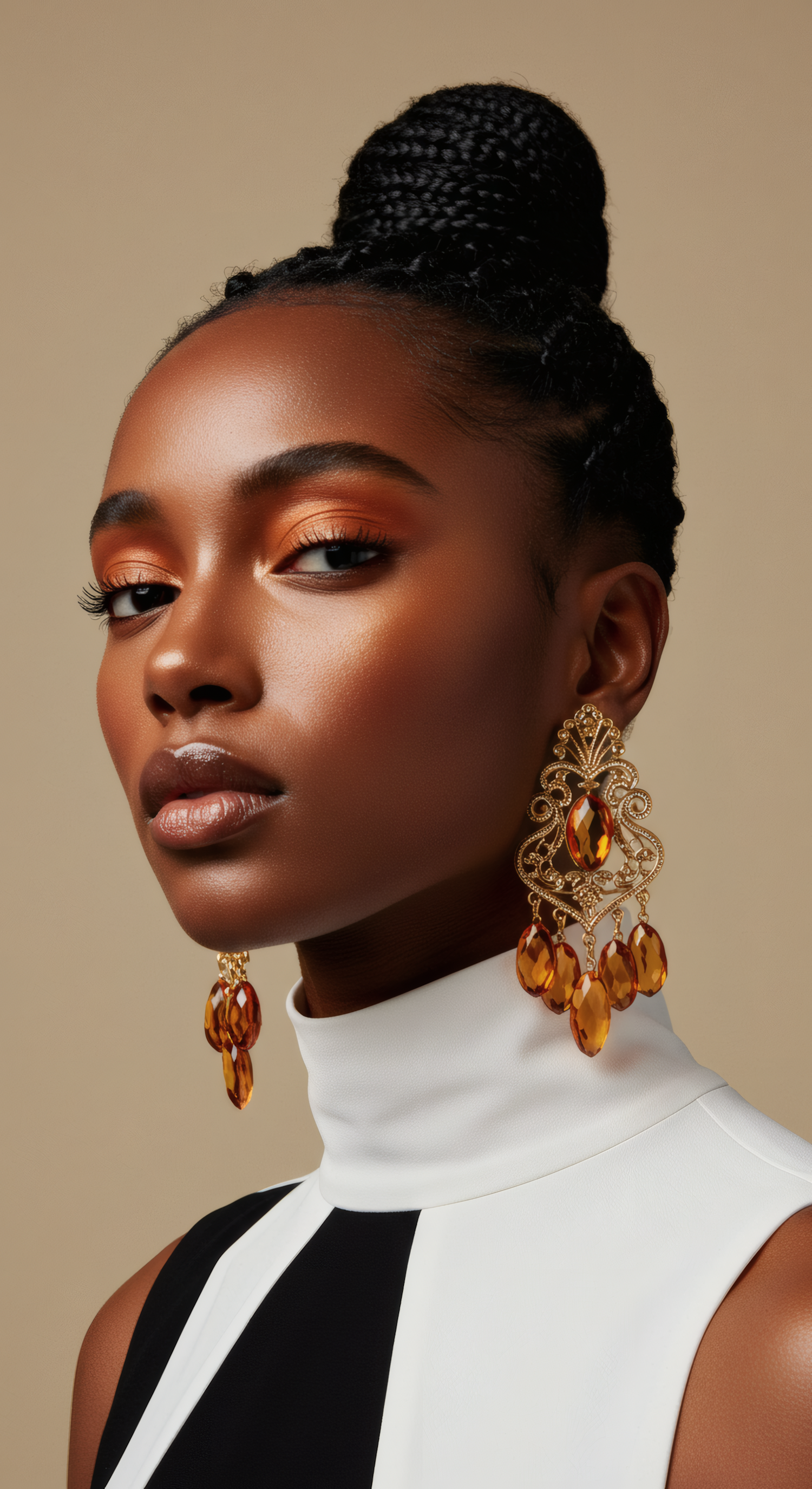 Elegant Black woman with braided bun, bold orange eyeshadow, and ornate gold earrings. High-necked black and white outfit adds sophistication.