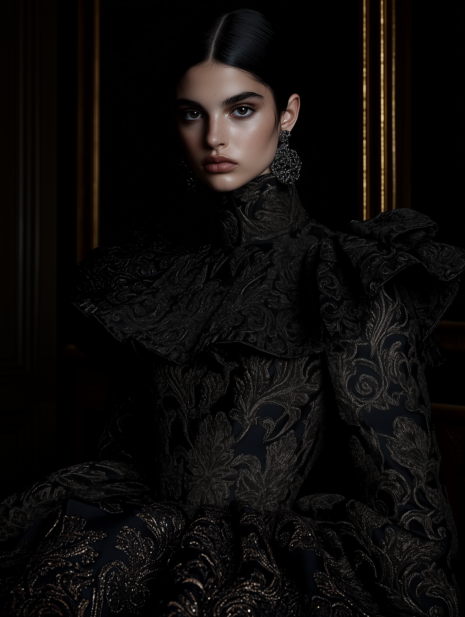 Elegant woman in a dark, intricately patterned dress with striking earrings, set against a dark background.