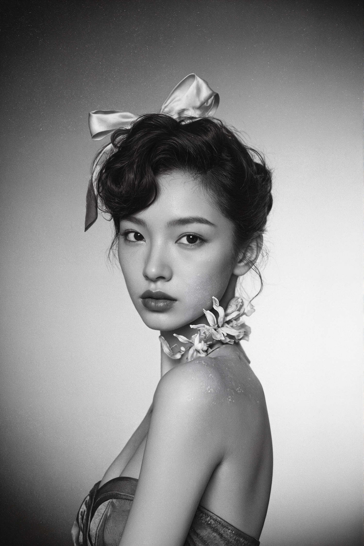 Elegant black and white portrait of an Asian woman with a floral necklace and satin bow, exuding timeless sophistication.