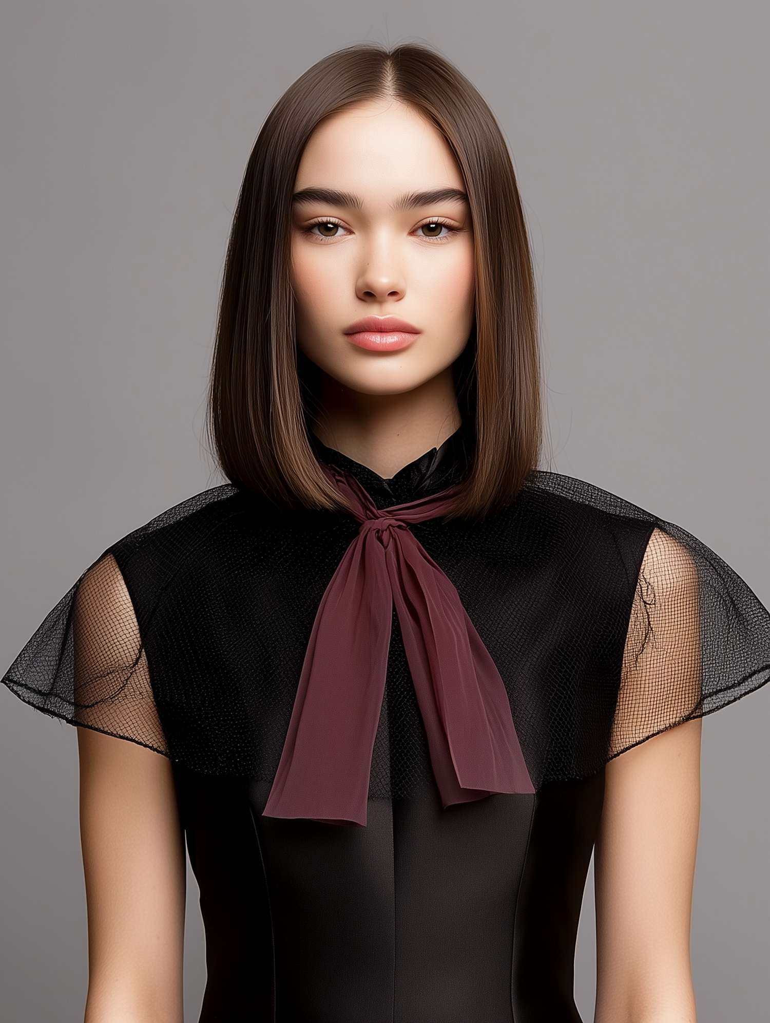 Elegant portrait of a young woman with brown hair, wearing a black dress and burgundy bow, set against a neutral background.