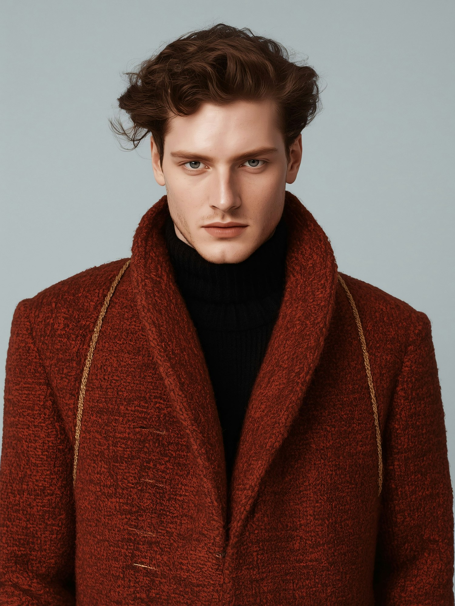 Stylish man in a red textured coat with gold accents and a black turtleneck, posing against a light gray background.