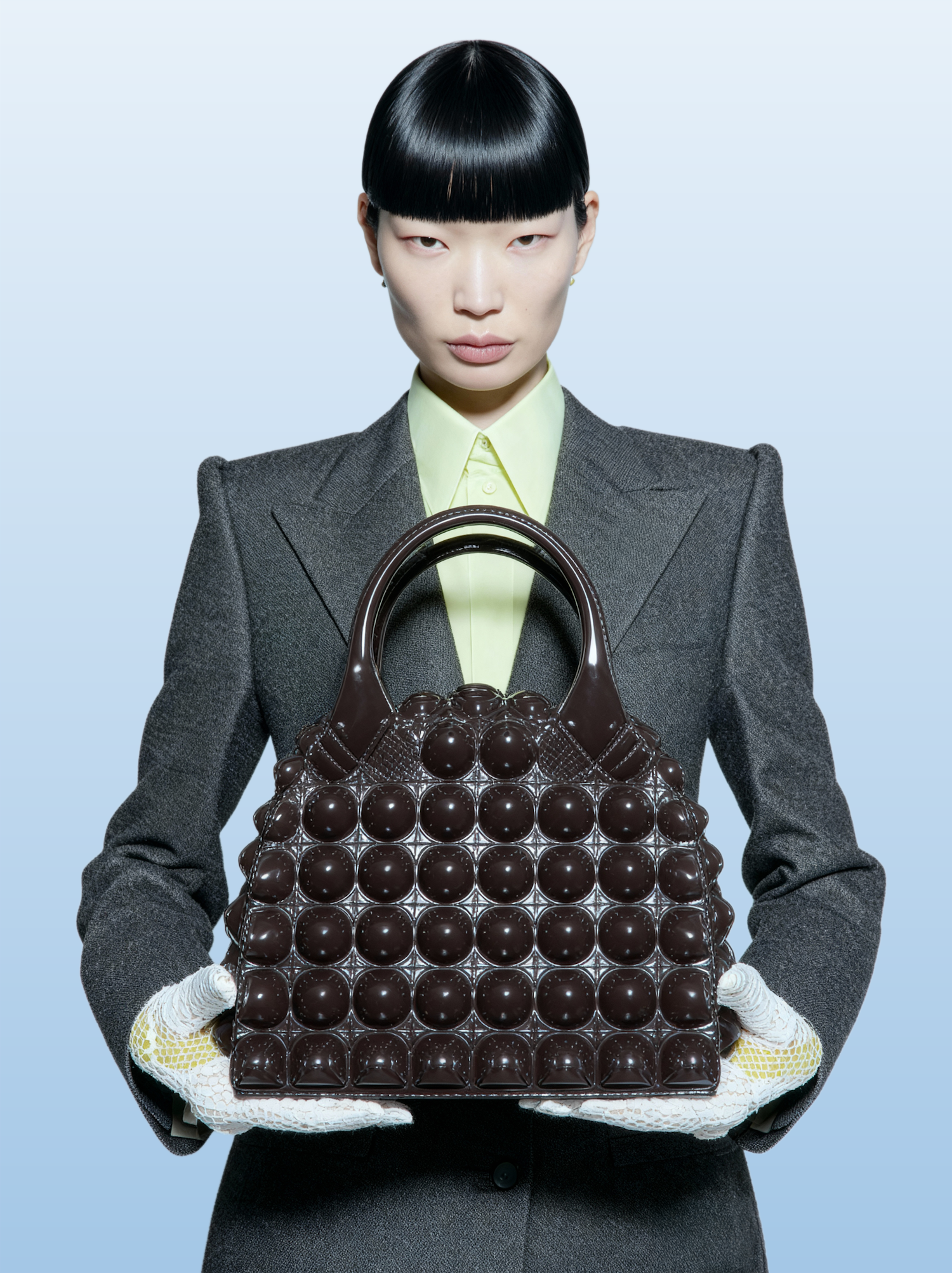 A stylish individual in a gray suit holds a textured brown handbag against a light blue background, showcasing modern fashion.