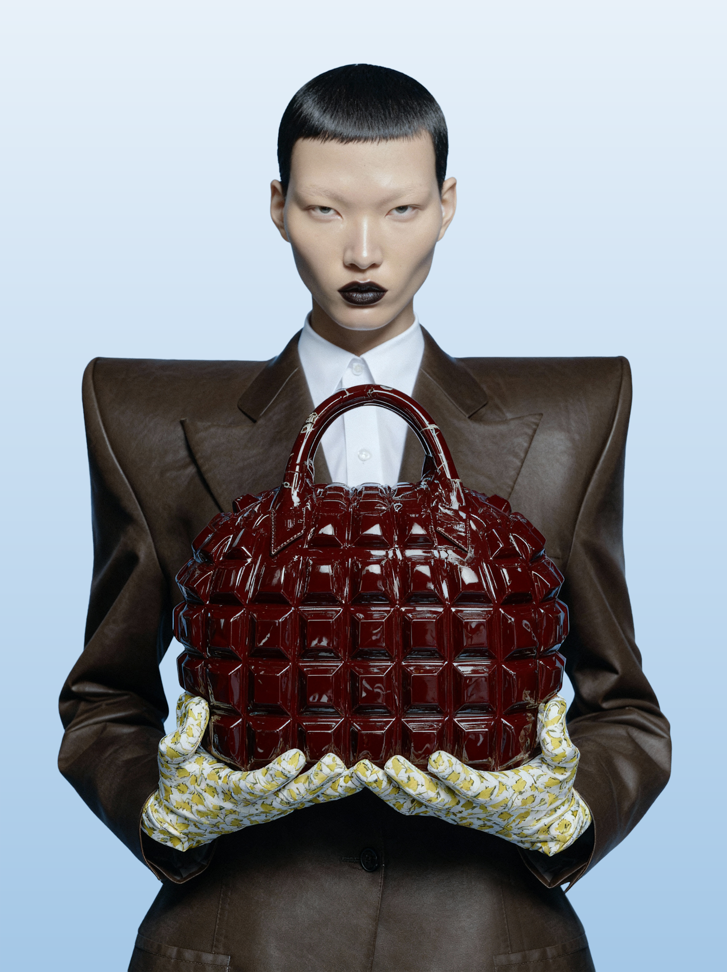 A person in a structured outfit holds a glossy burgundy handbag, wearing floral gloves, against a light blue background.