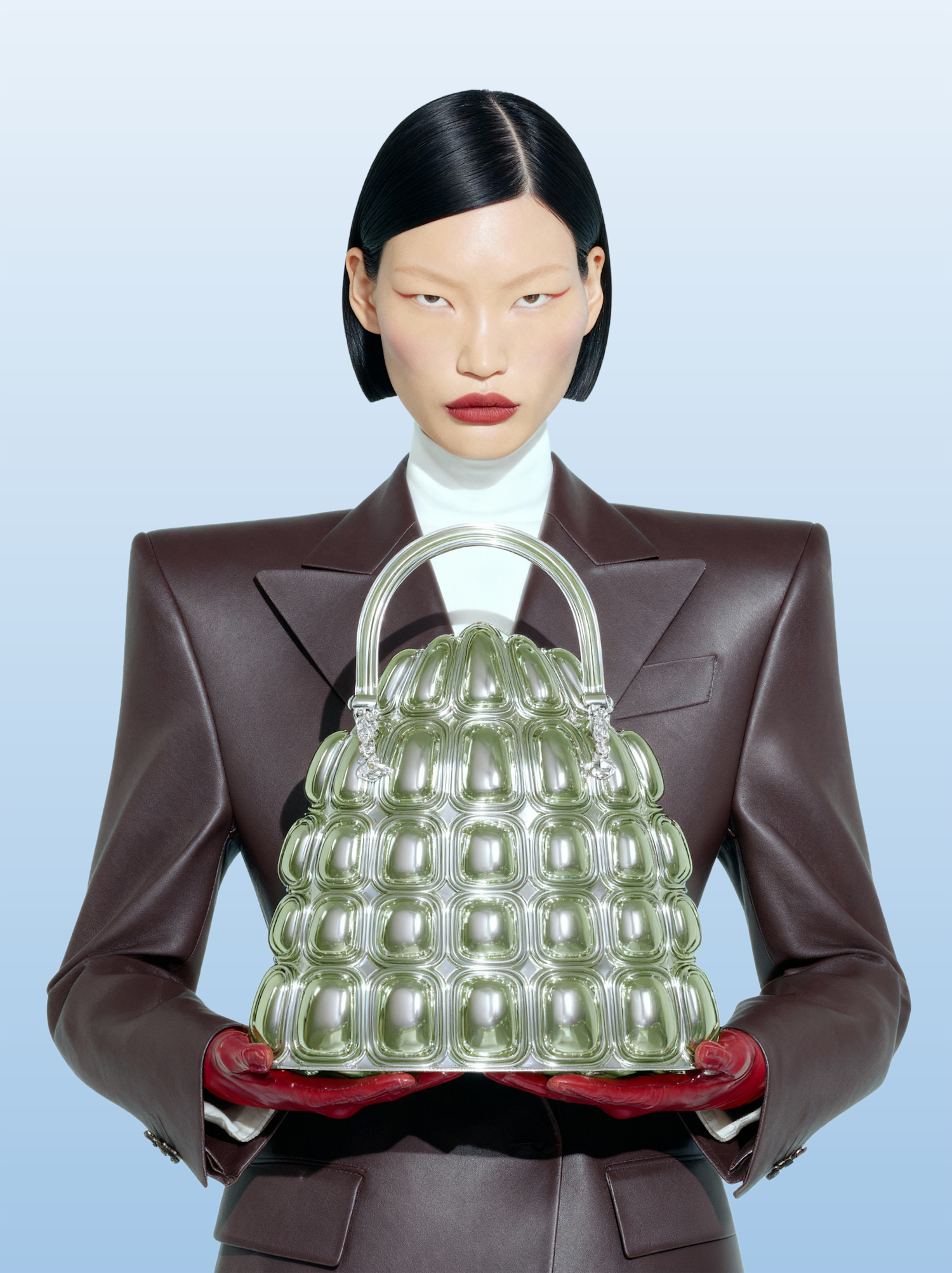 A stylish individual in a brown leather jacket holds a futuristic metallic handbag with a grid pattern, set against a light blue background.