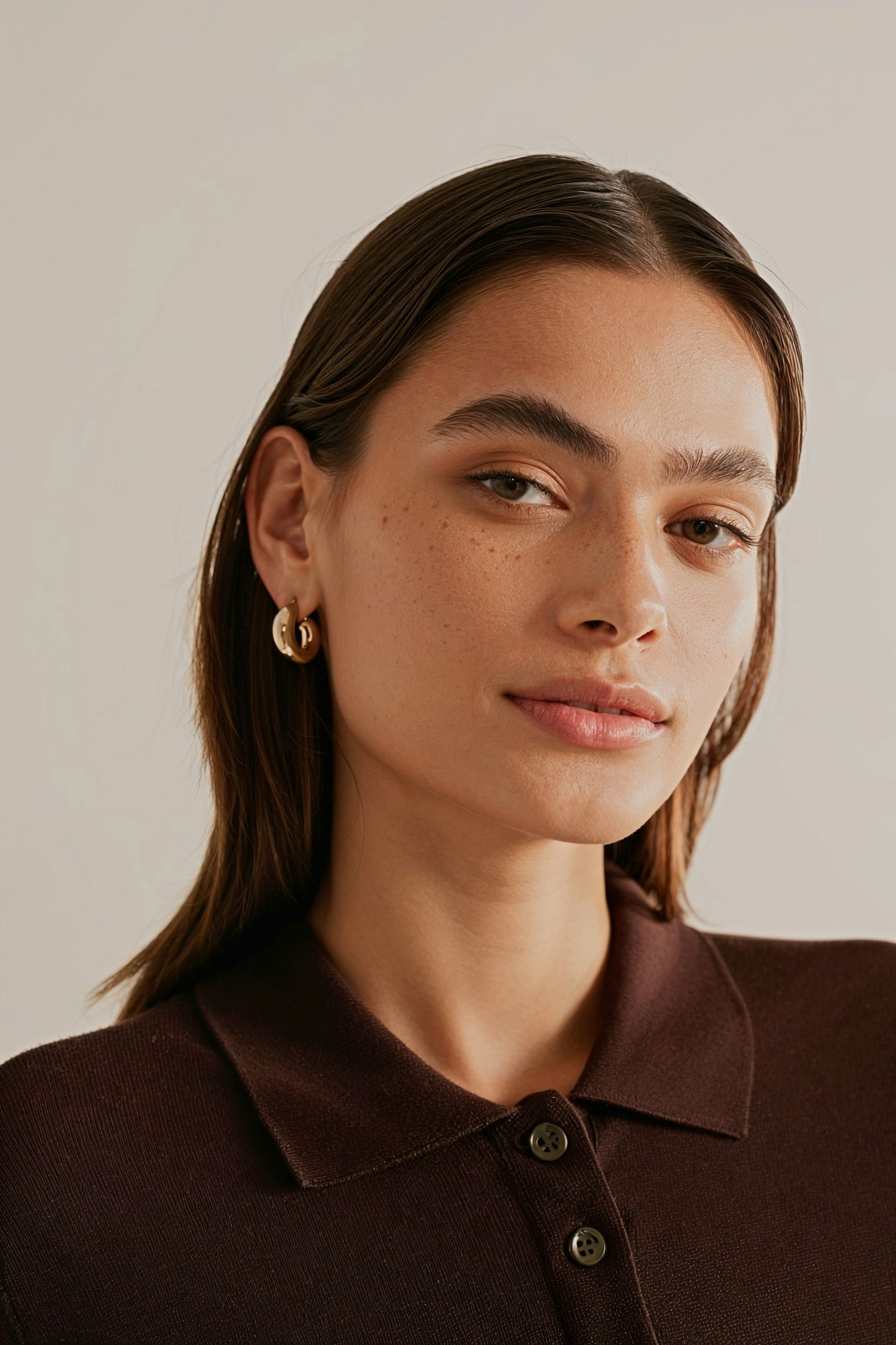A portrait of a person with a calm expression, adorned with gold hoop earrings and wearing a maroon collared shirt, on a beige background.