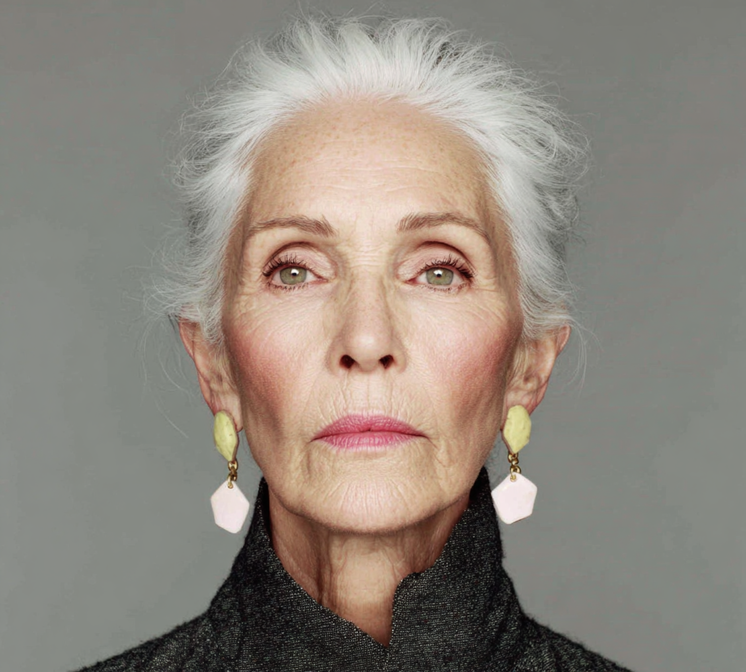 A striking portrait of an older woman with white hair, wearing statement earrings and a dark top, set against a plain gray background.