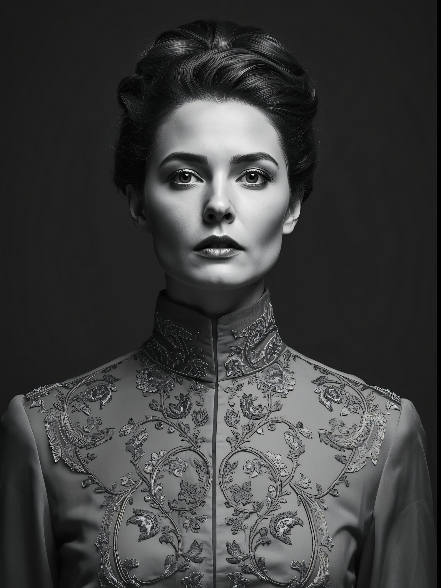 Monochrome portrait of a poised woman in an embroidered high-collared outfit, with styled hair and a captivating gaze.