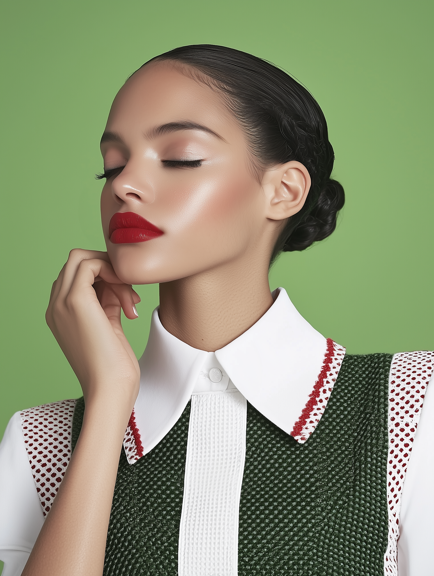Elegant portrait of a woman with bold red lipstick, sleek hair, and a green textured outfit against a vibrant green background.