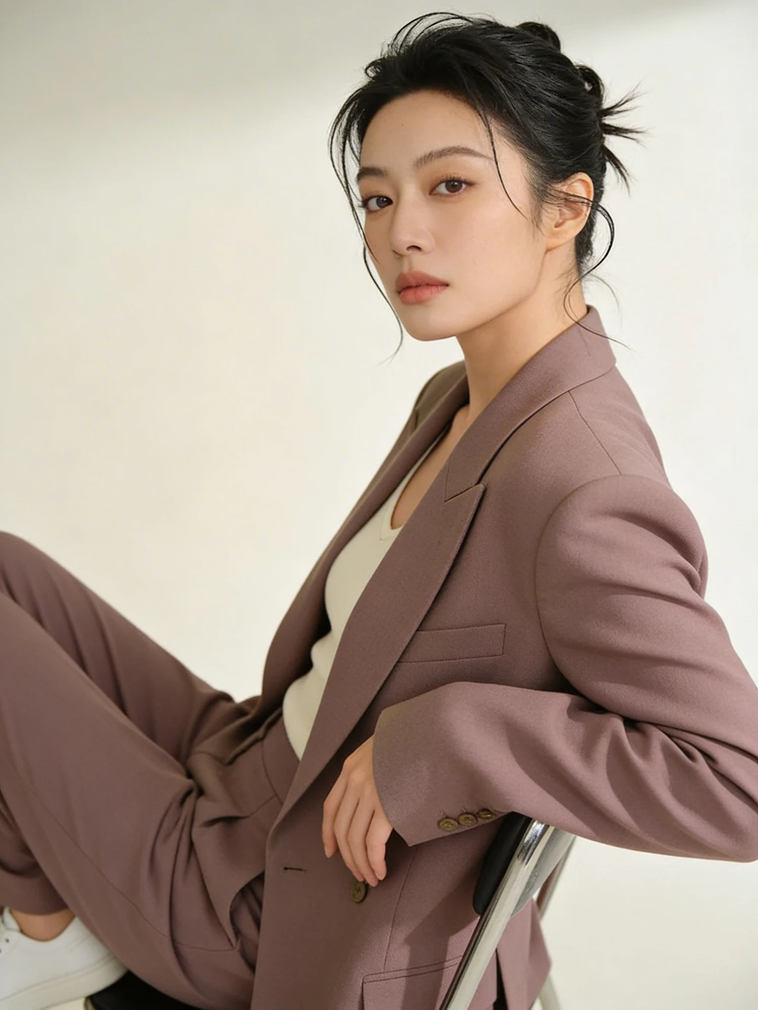 A person in a mauve suit and white top sits on a chair against a neutral background, exuding a professional and composed vibe.