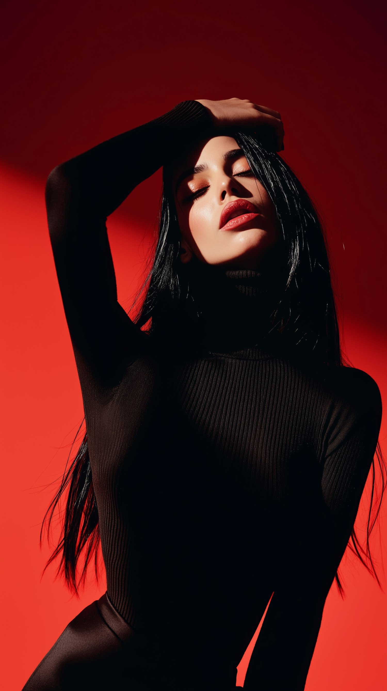 A striking portrait of a woman in a black turtleneck against a red background, showcasing bold makeup and dramatic lighting.