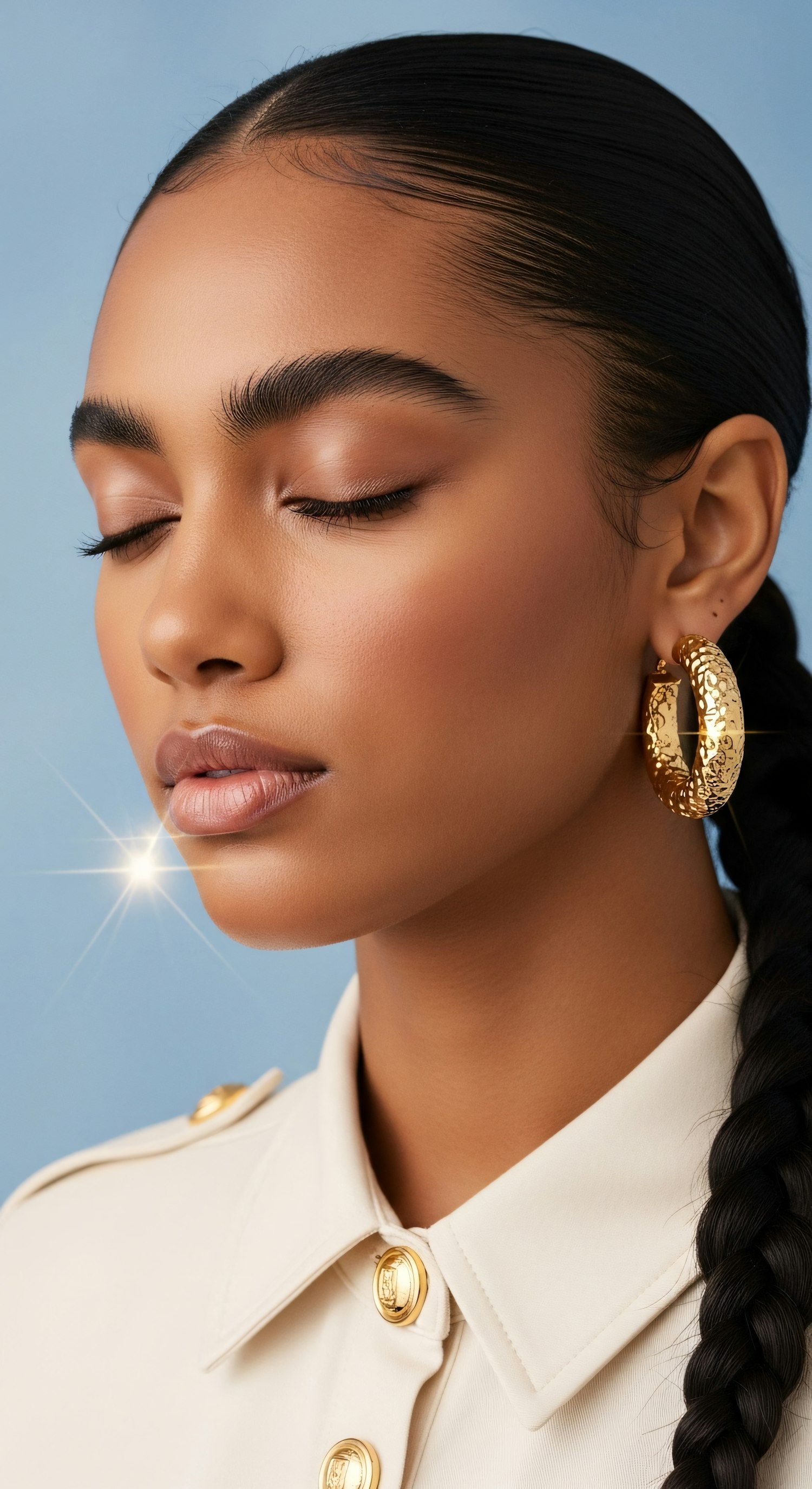 A serene profile shot highlighting elegant gold accessories against a backdrop of a white shirt and light blue background.