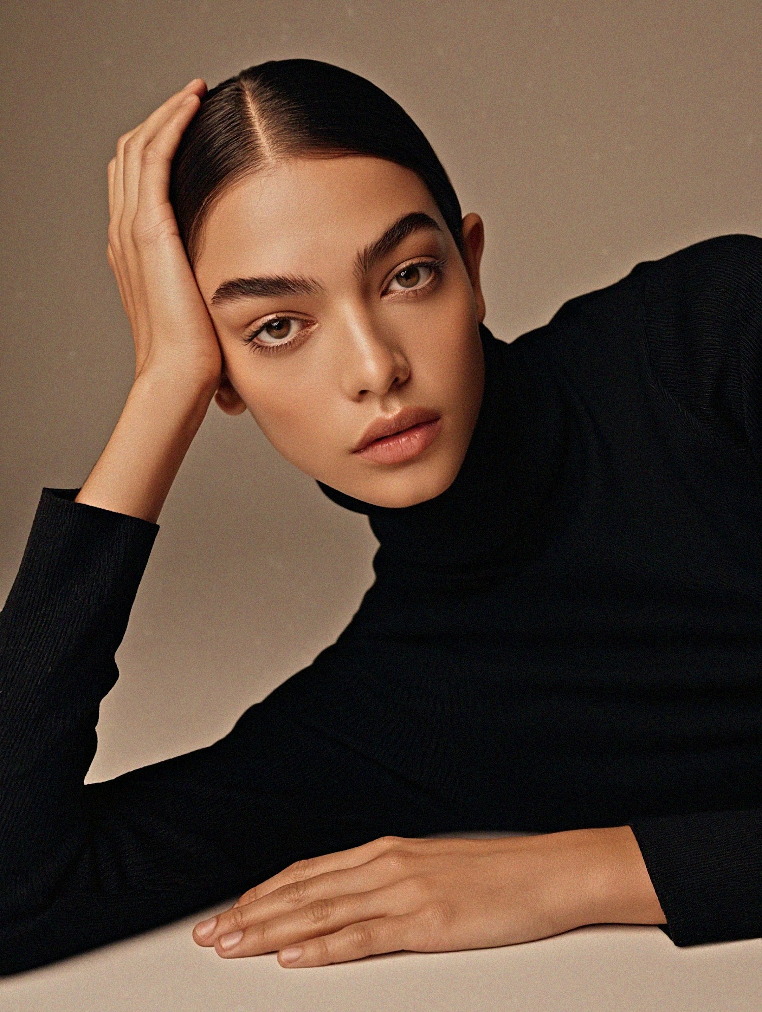 Close-up of a woman with sleek hair, hazel eyes, and a black turtleneck, posing against a beige background. Minimalist and elegant.