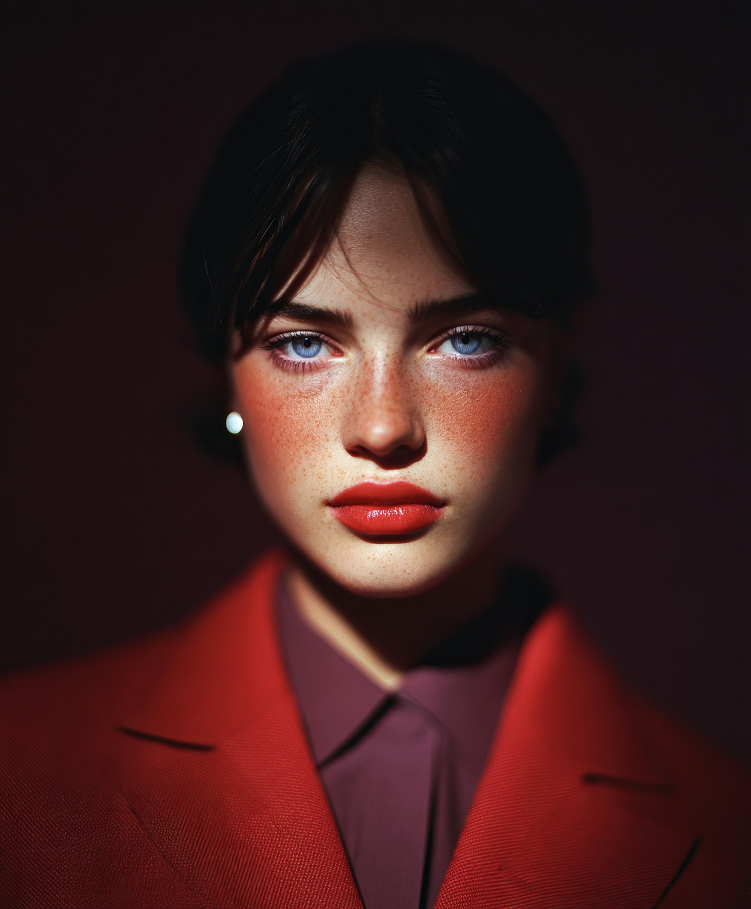 A striking portrait of a person with blue eyes, red blazer, and vibrant lighting, emphasizing their features against a dark background.