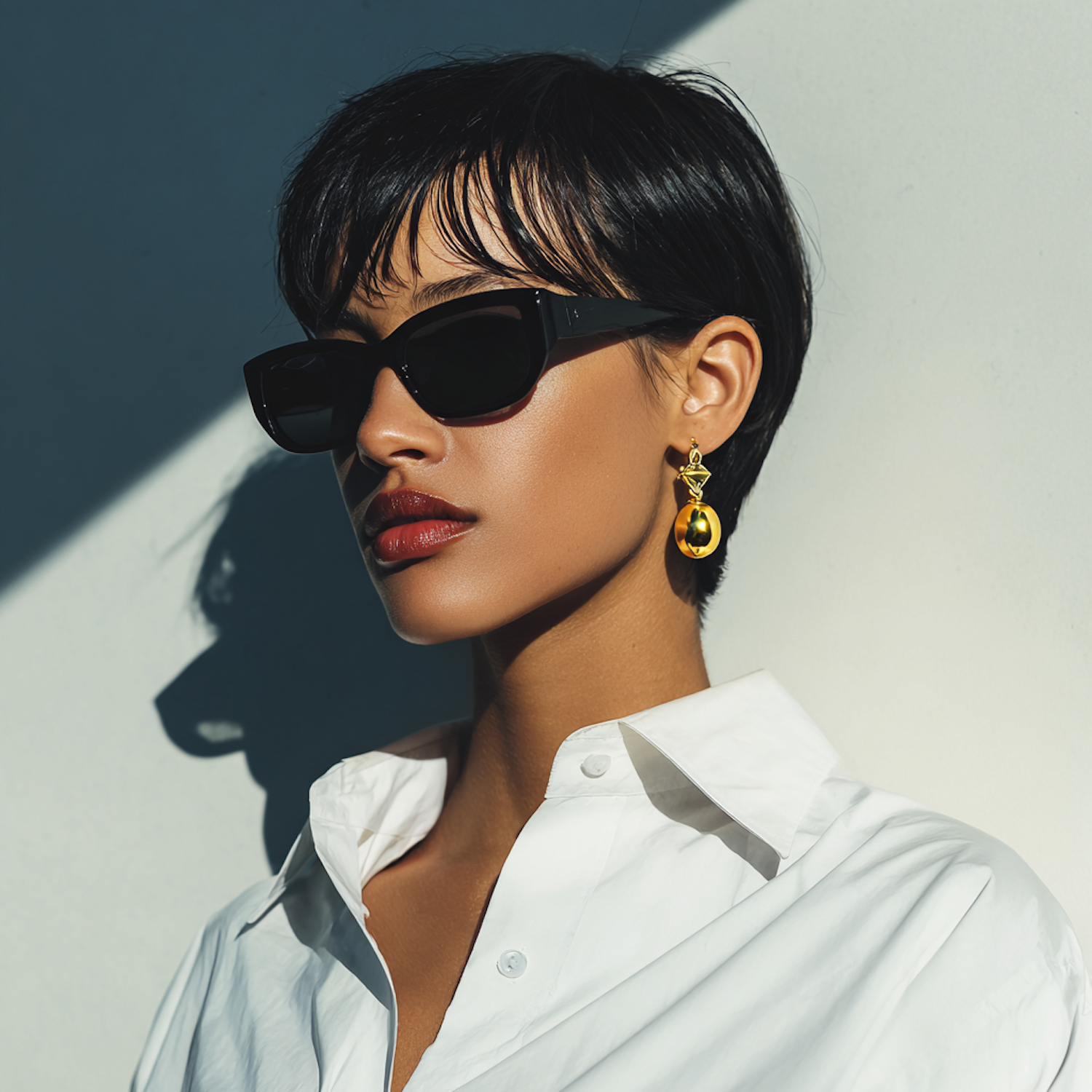 A fashionable person in a white shirt, black sunglasses, and gold earrings, captured in dramatic lighting with a minimalist background.