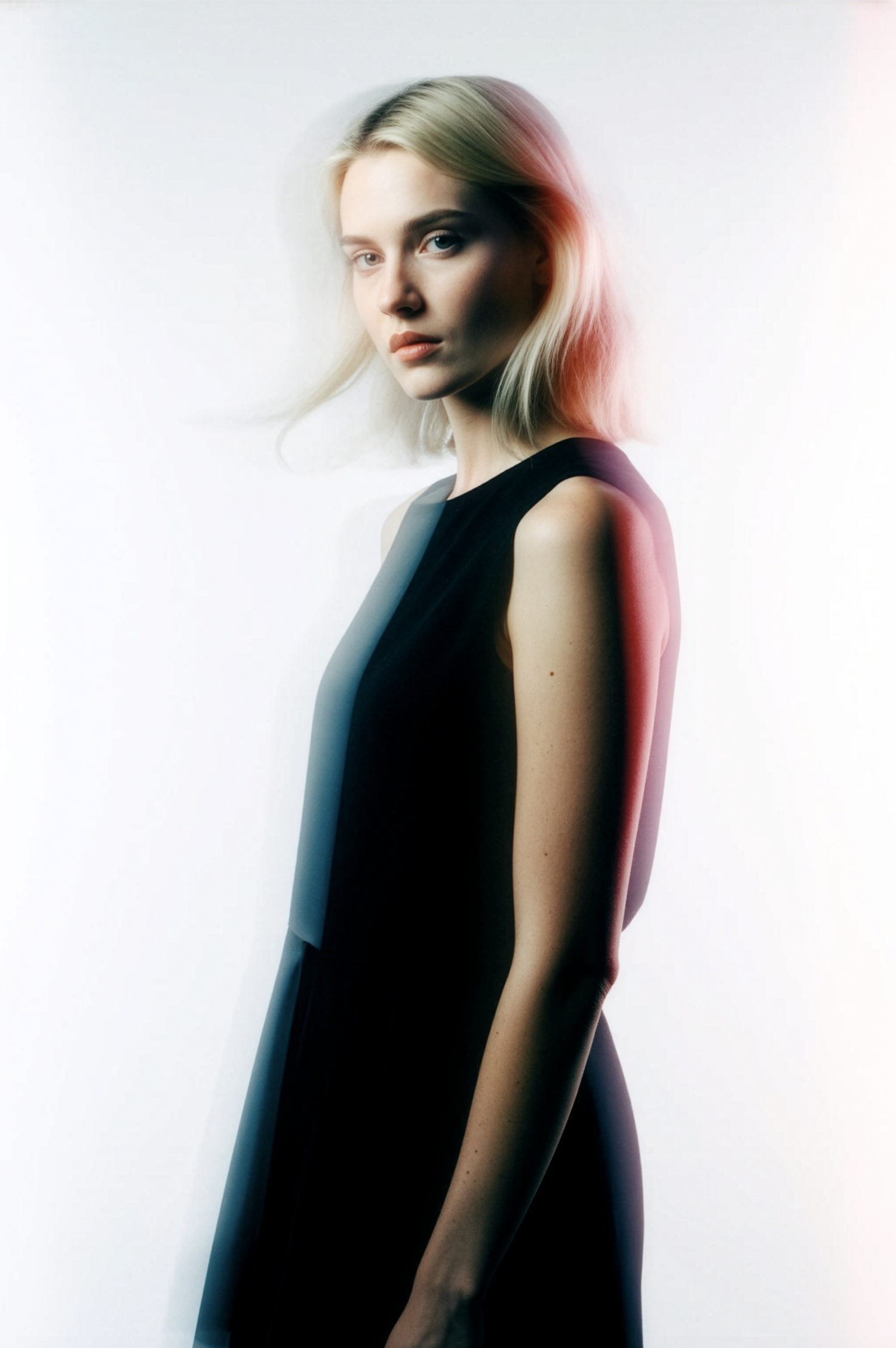 A serene portrait of a blonde woman in a black dress, with soft lighting and subtle color gradients creating an ethereal effect.