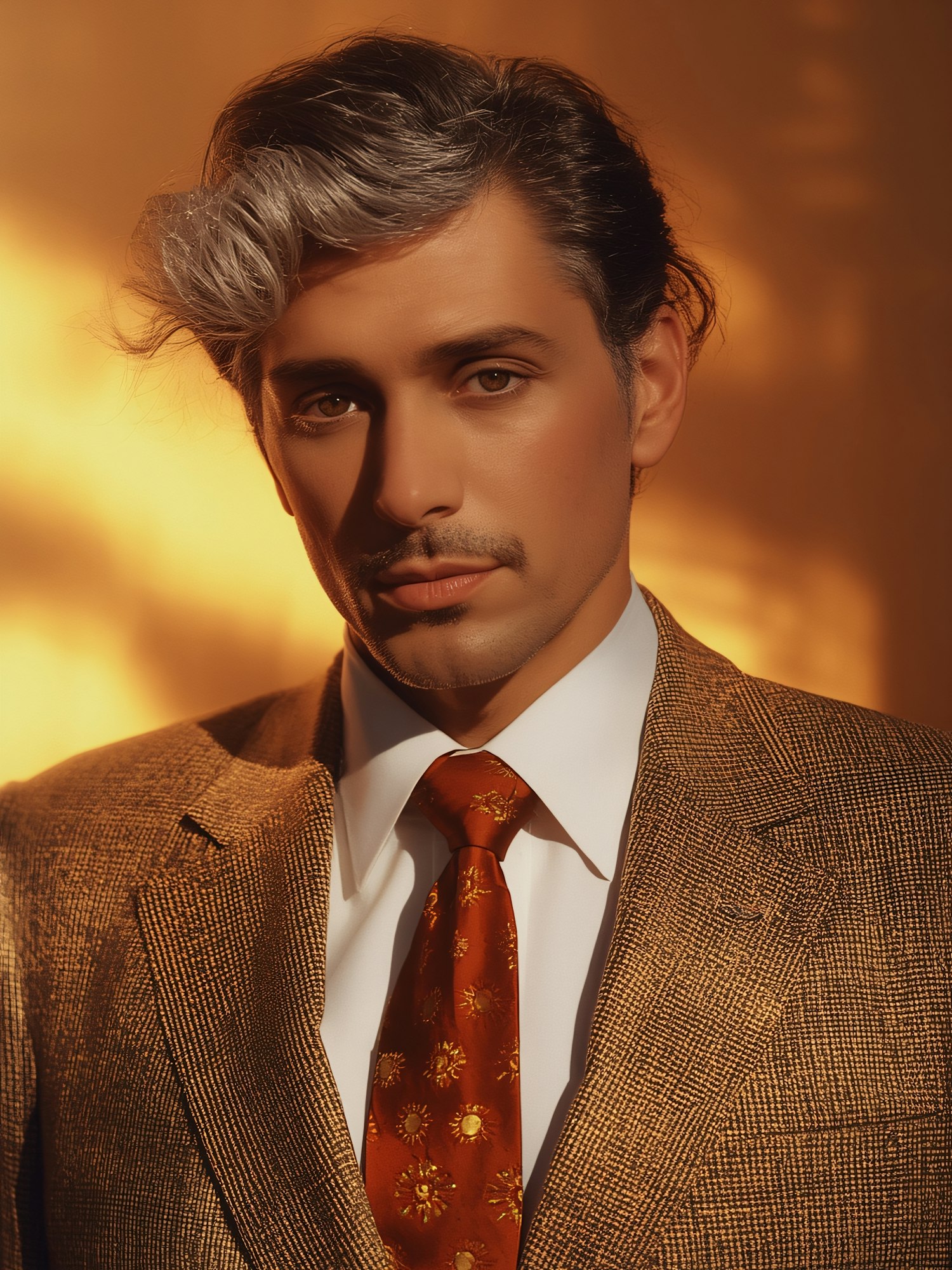 A man in a brown suit and orange tie with a sun pattern, set against a warm, golden background, exudes a classic and refined style.