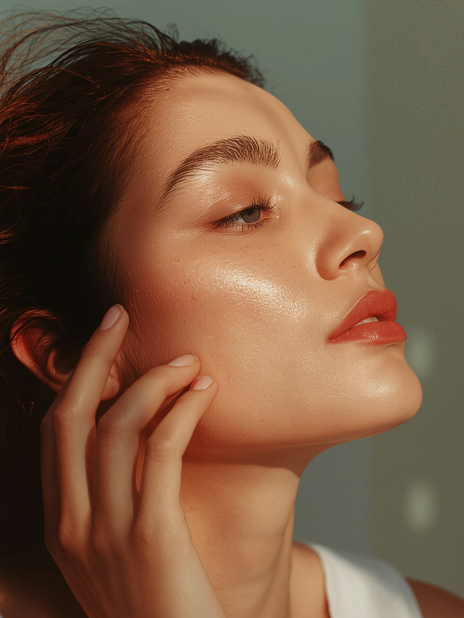 Close-up of a person with radiant skin, red lips, and styled hair, highlighting their natural beauty with soft lighting and elegant composition.