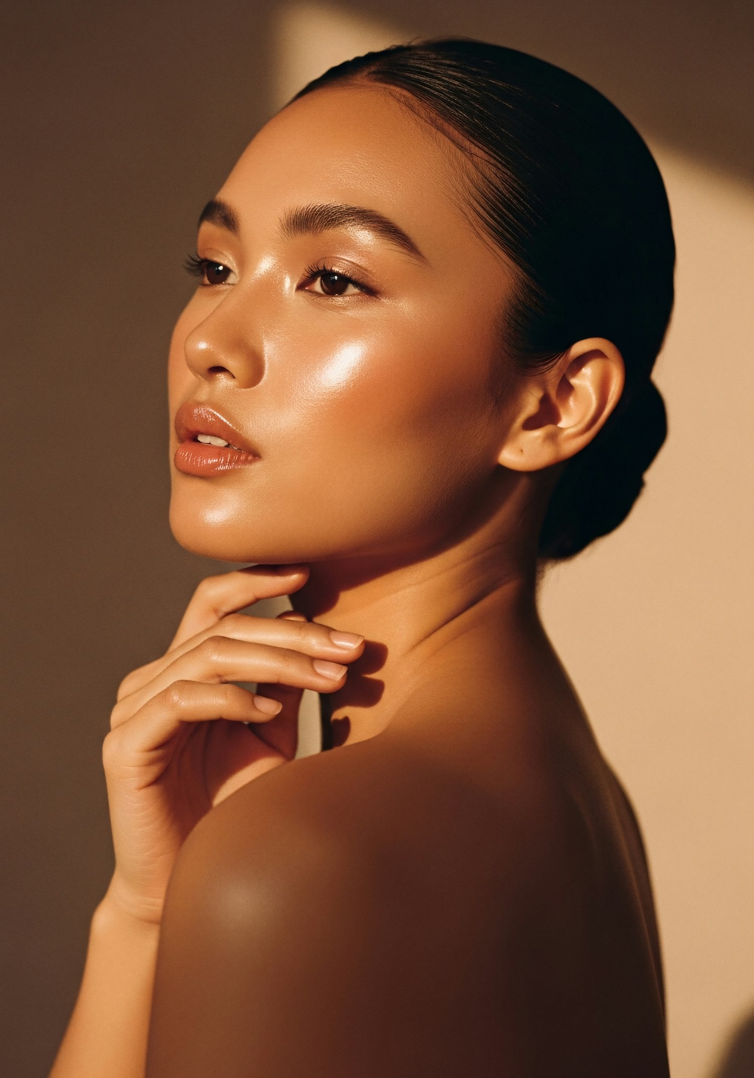 A close-up portrait showcasing glowing skin and serene expression, with warm lighting emphasizing the subject's elegant features.