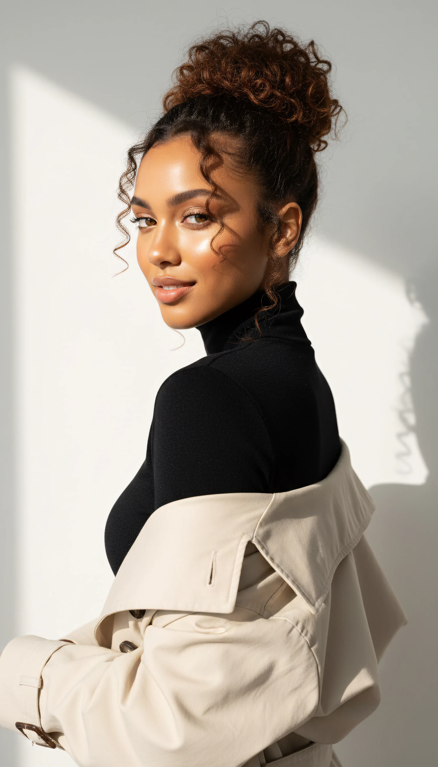 A stylish woman with curly hair in a bun, wearing a black turtleneck and beige trench coat, in a softly lit minimalist setting.