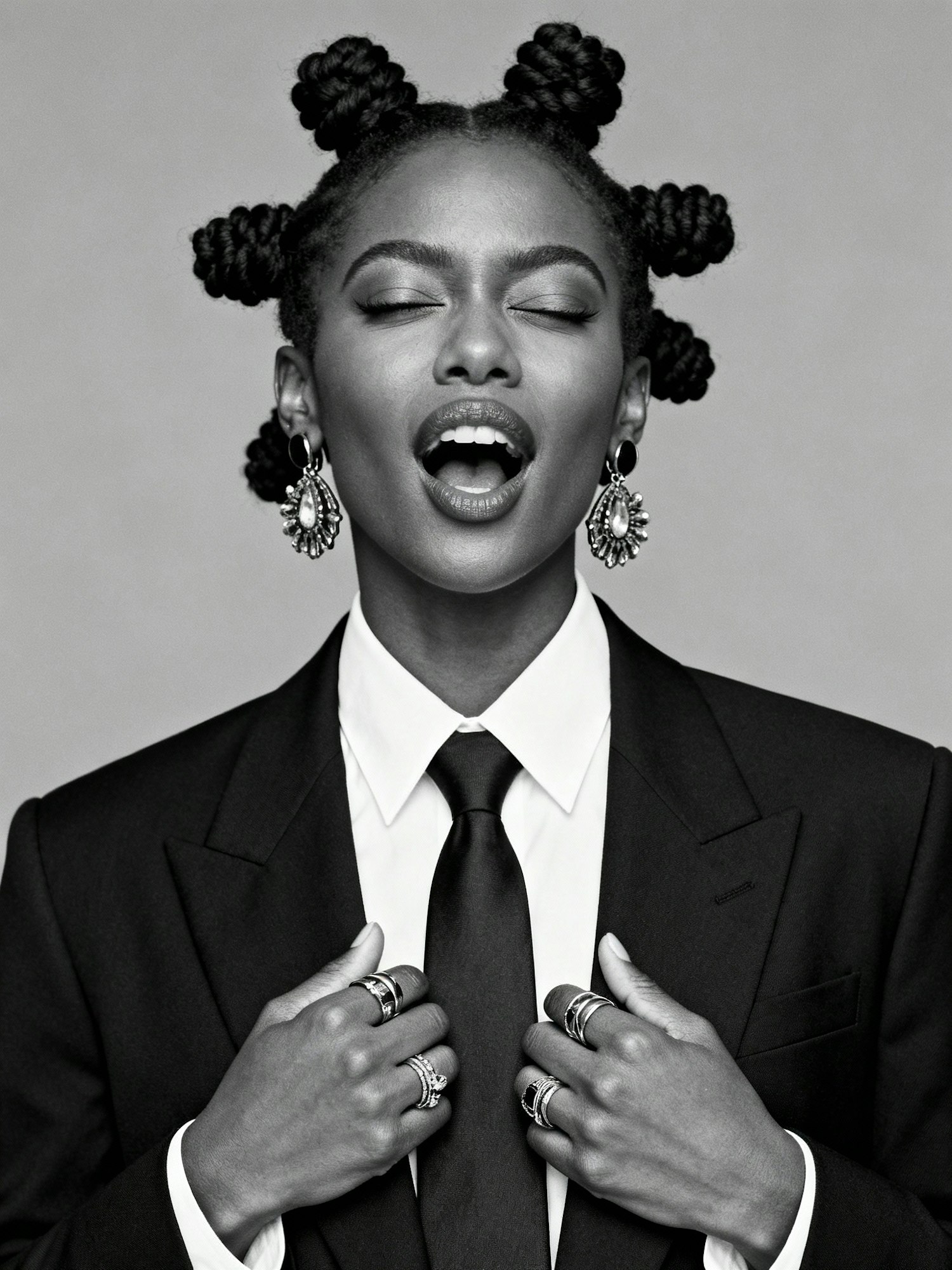 Waist-up, high-definition black-and-white tall portrait of a Black woman wearing a dark suit jacket, white collared shirt, and dark tie. Her hair is styled in multiple small twisted buns. She wears large decorative earrings and multiple rings on both hands. Her pose is expressive, with one eye closed and mouth slightly open, and her hands positioned near her tie. The neutral gray background enhances the contrast of the monochrome palette, making the layered textures and facial expression stand out. Lighting is soft and directional, casting gentle highlights across her face and garment. The mood is tailored, charismatic, and editorial—ideal for an Afro-fusion fashion portrait or expressive identity showcase.