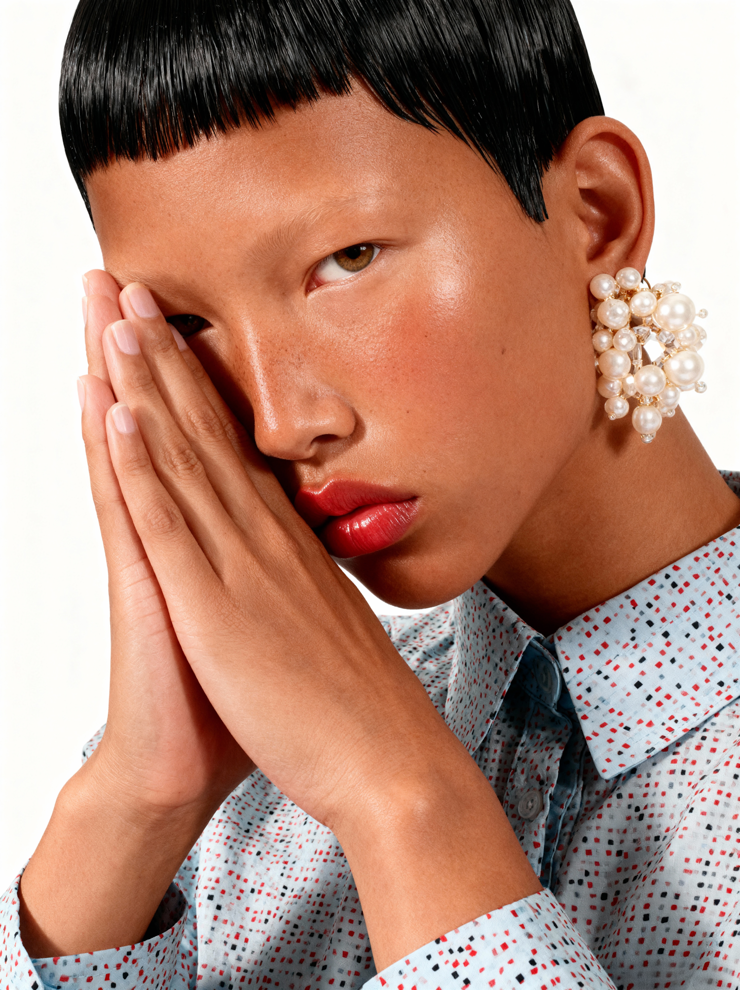 Close-up of a person with sleek black hair, vibrant red lips, and a pearl earring, wearing a patterned blue shirt against a white background.