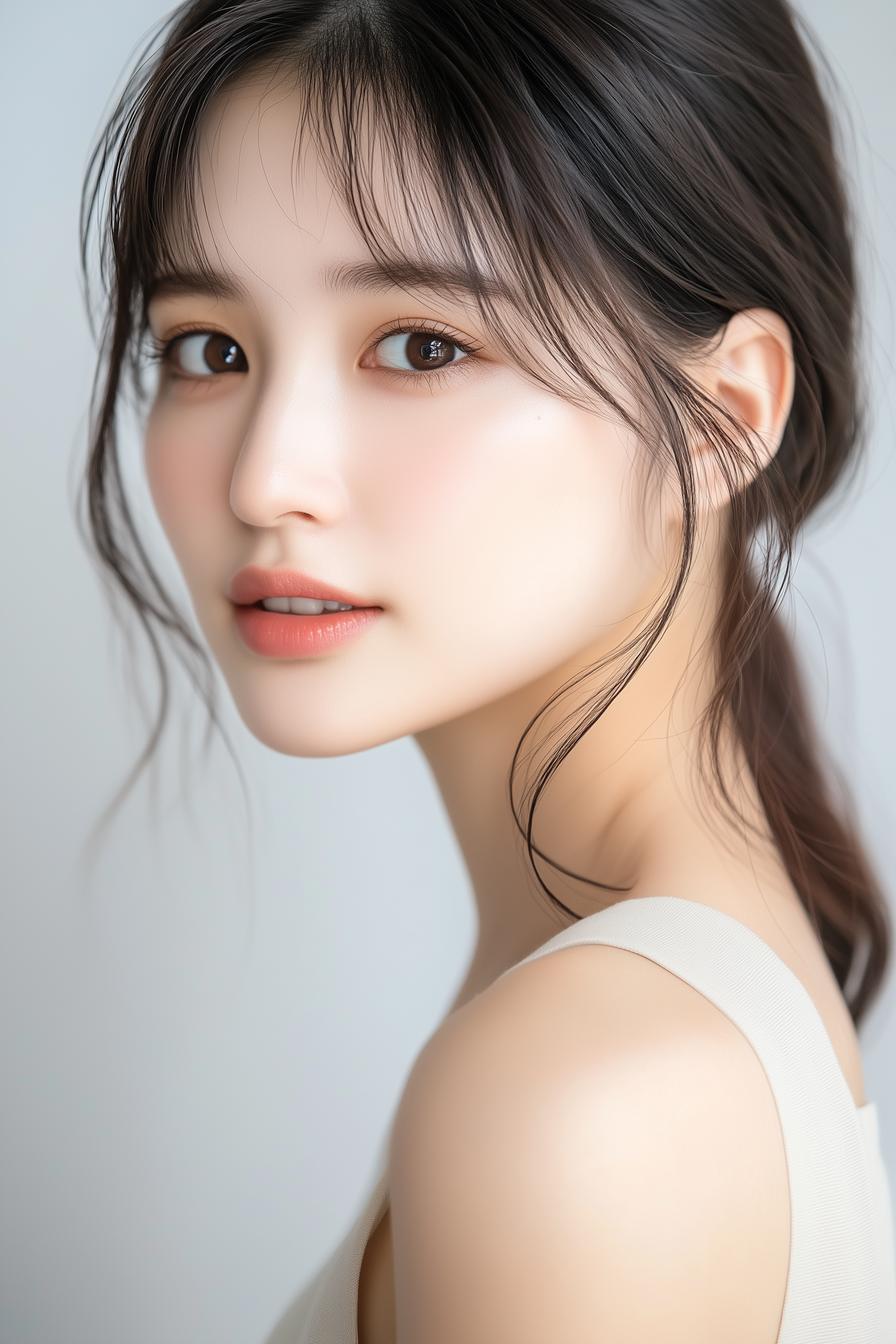 Close-up of a young woman with soft makeup, dark brown hair, and a serene expression, set against a light gray background.