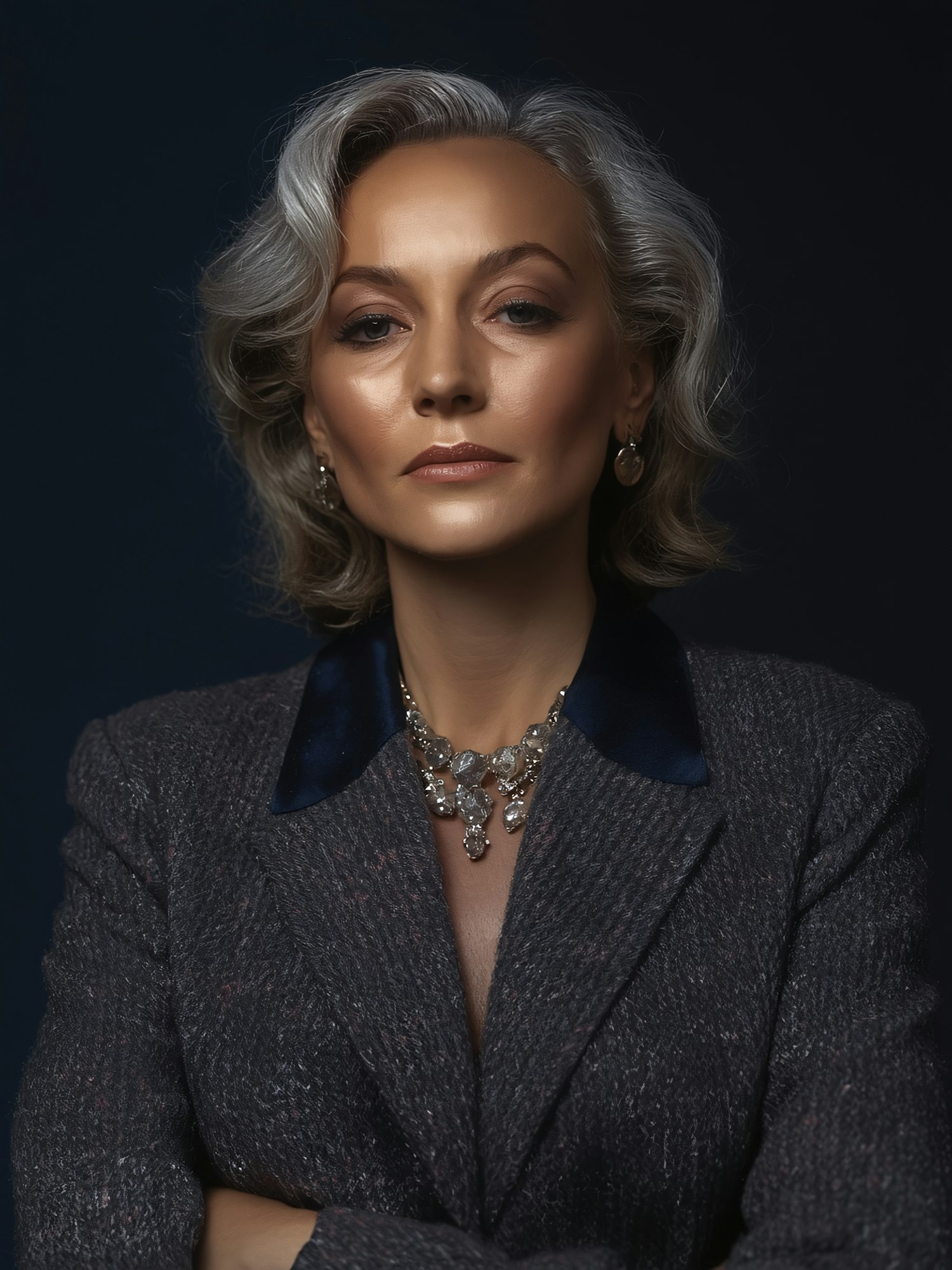 Elegant woman with silver hair in a dark blazer and statement necklace, posing against a deep background.