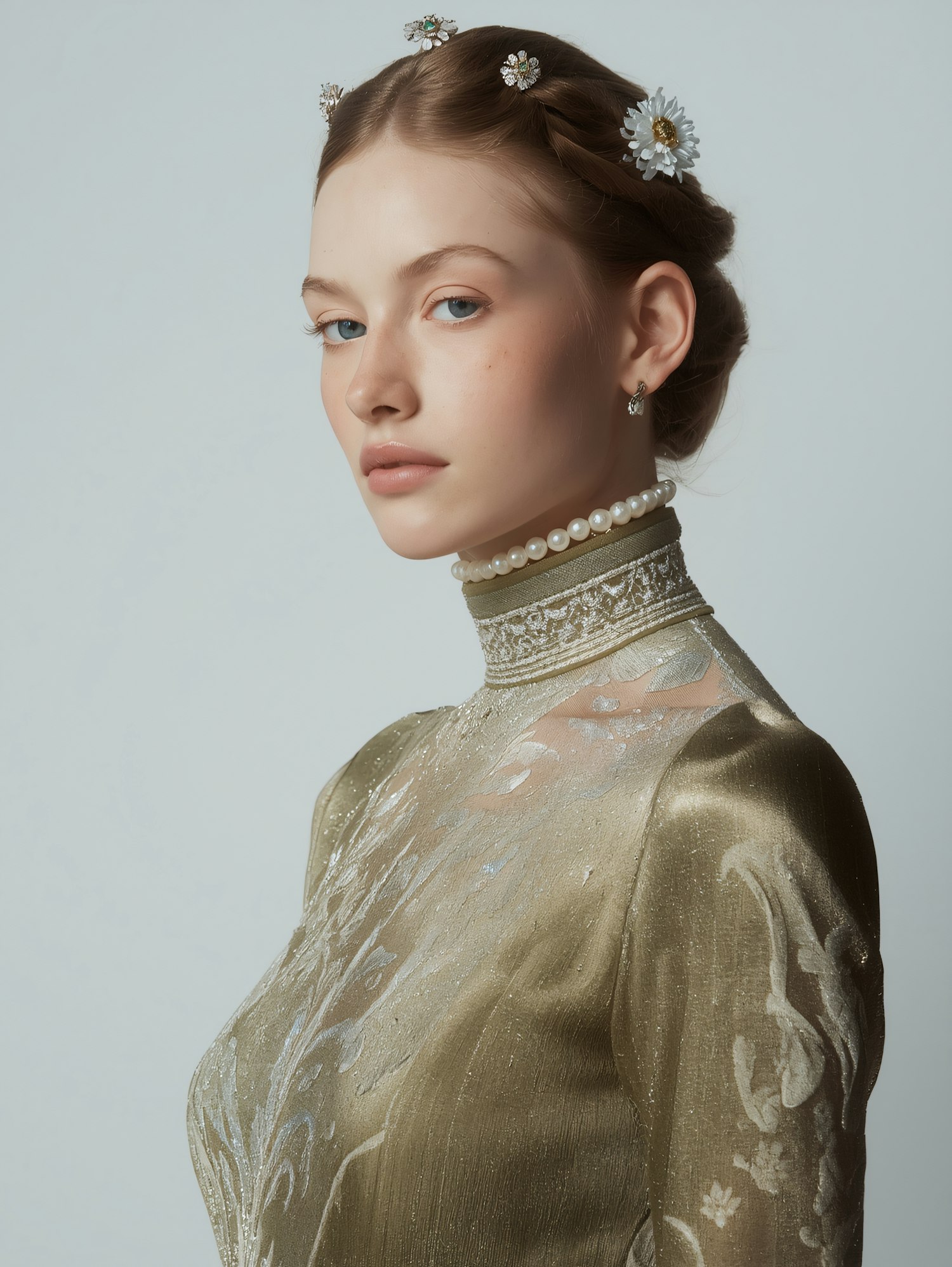 A portrait of a woman in a gold dress with floral hairpins and a pearl necklace, showcasing elegance and intricate details.