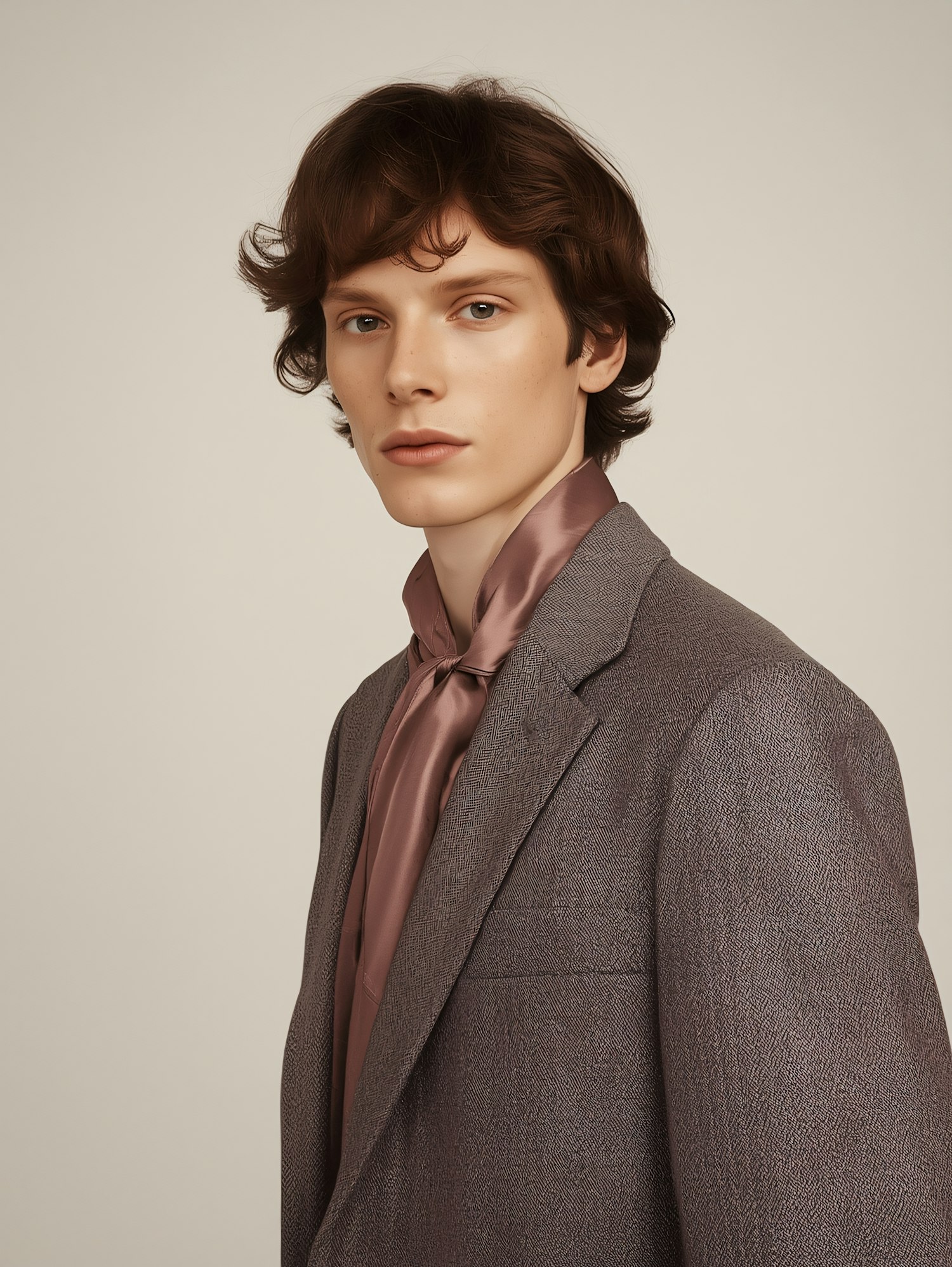 A stylish portrait of a person in a textured gray blazer and mauve scarf, set against a neutral background for a refined look.