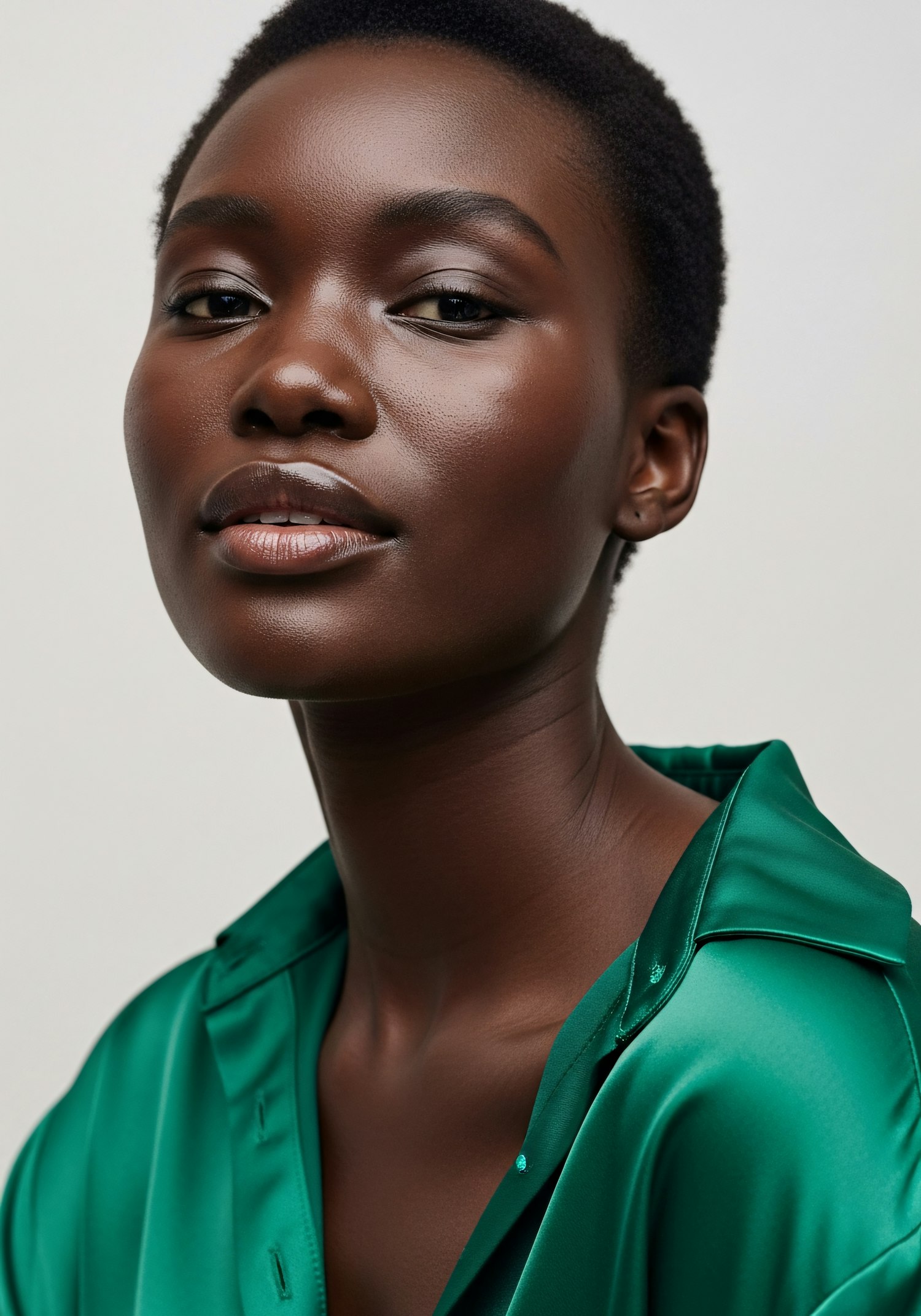 Close-up portrait of a person in a green satin shirt, showcasing smooth skin and a confident expression against a neutral background.