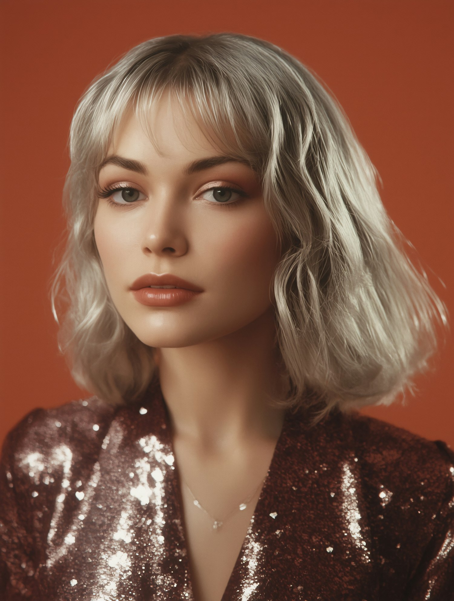 Stylish portrait of a woman with silver-blonde hair, wearing a shimmering red outfit against a vibrant orange background.