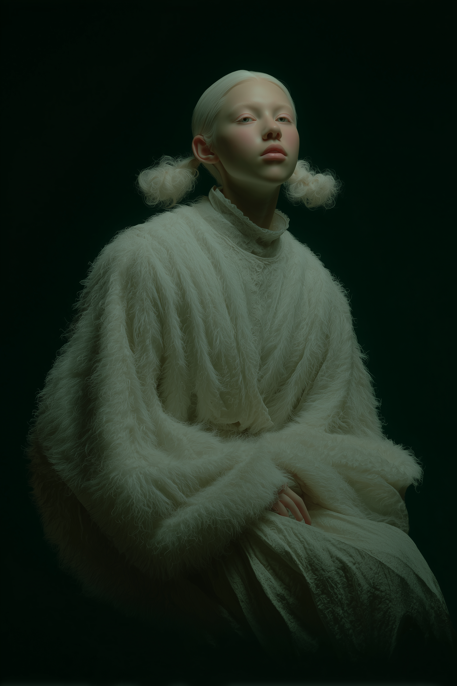A striking portrait of a person in a textured white outfit, set against a dark background with dramatic lighting.