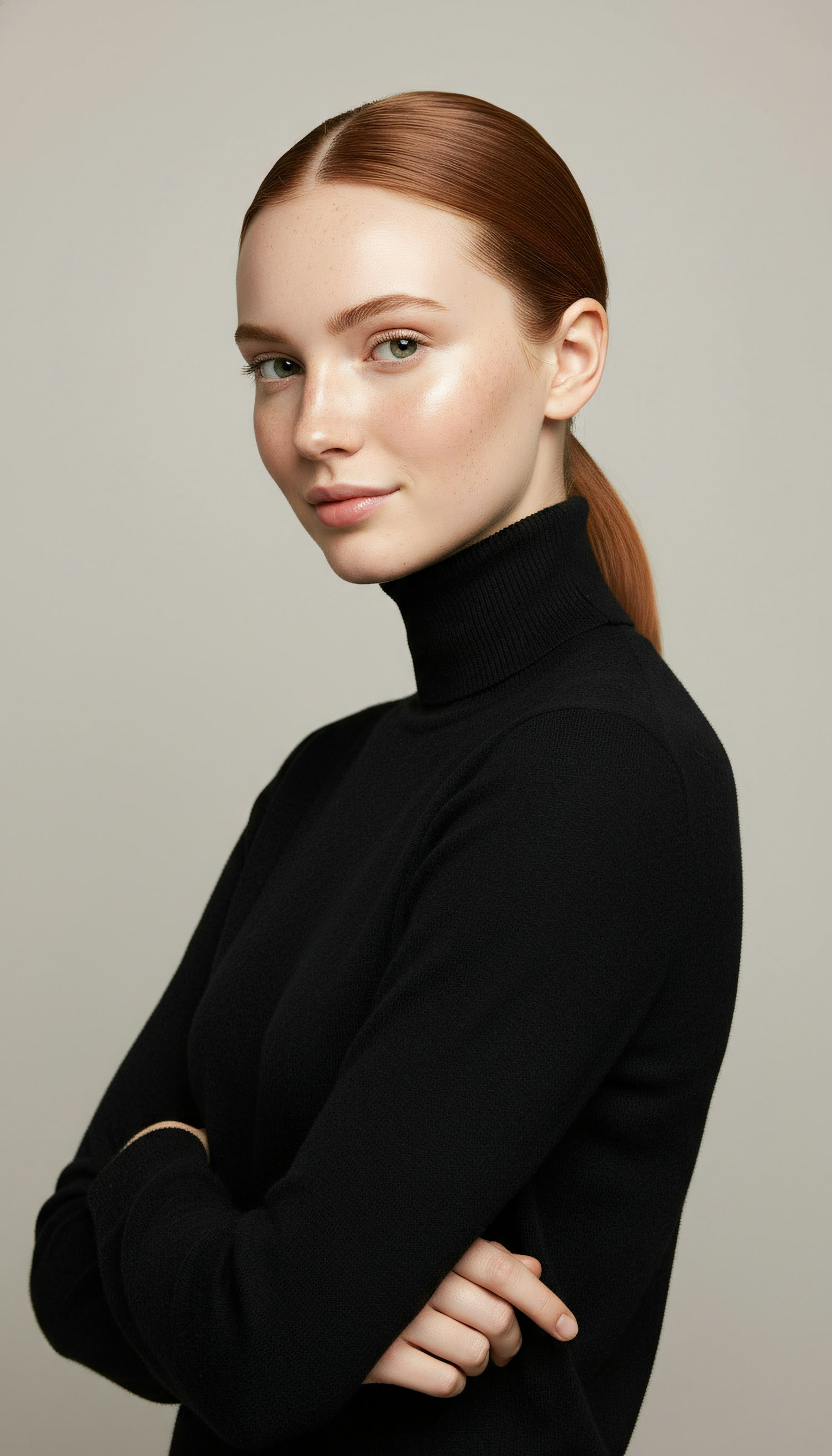 Portrait of a young woman with red hair in a sleek ponytail, wearing a black turtleneck, against a neutral background.