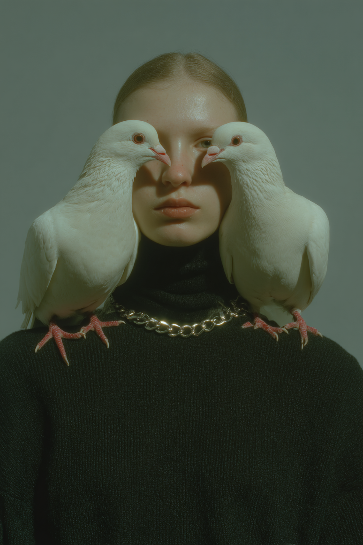 Artistic portrait of a model in black with two white doves on shoulders, emphasizing symmetry and contrast.