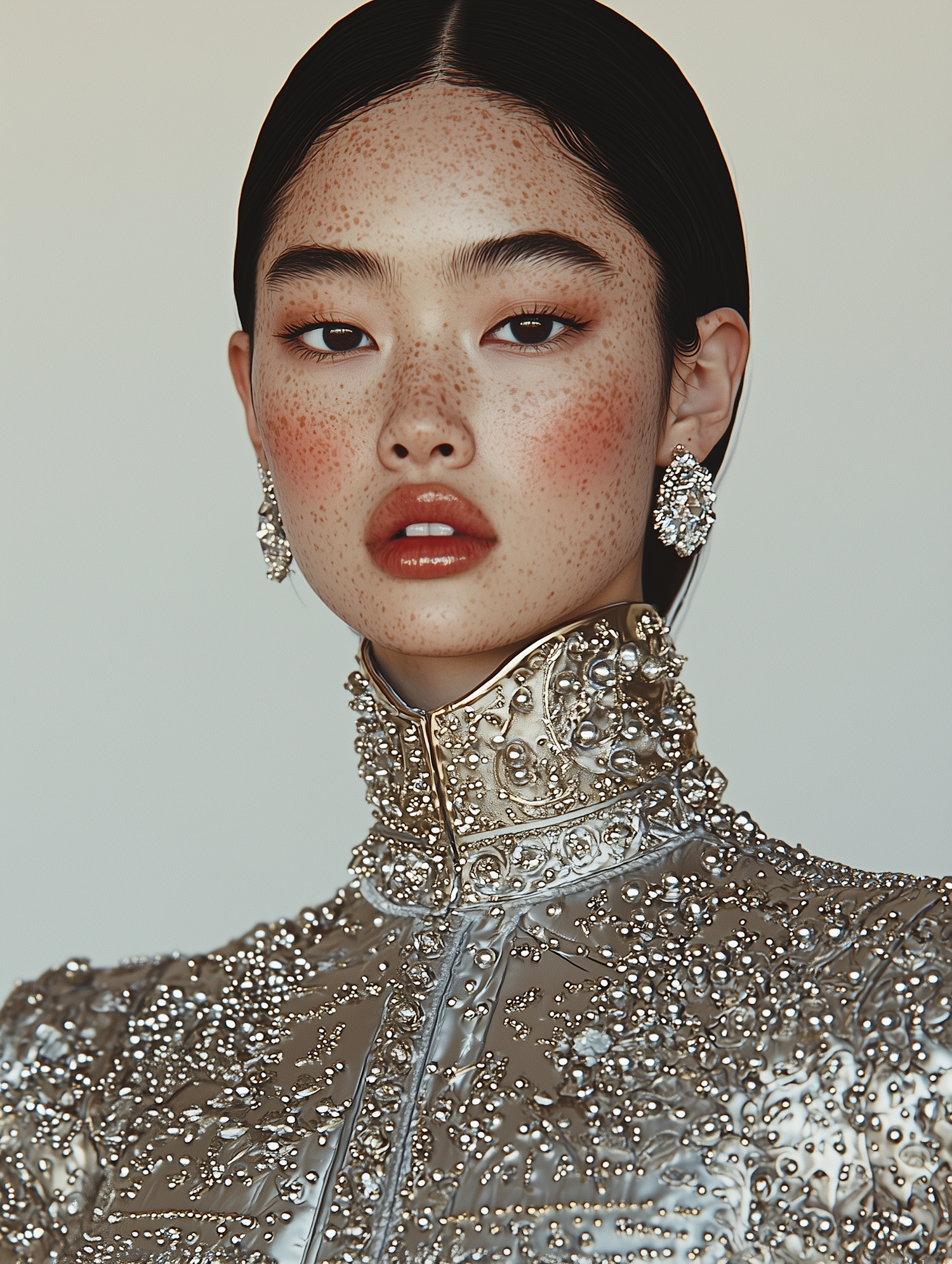 Elegant portrait of an Asian woman with freckles, wearing a pearl-embellished outfit and ornate earrings, exuding sophistication.