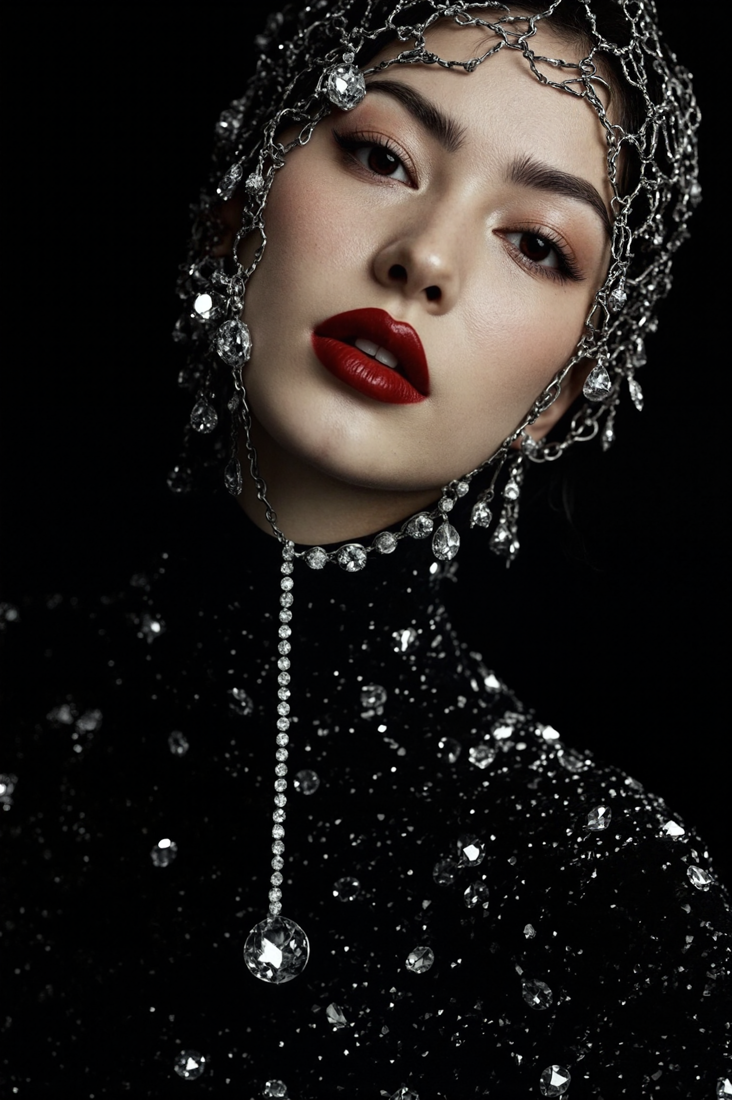 Elegant woman in crystal-studded headpiece with bold red lips against a black background, exuding luxury and sophistication.