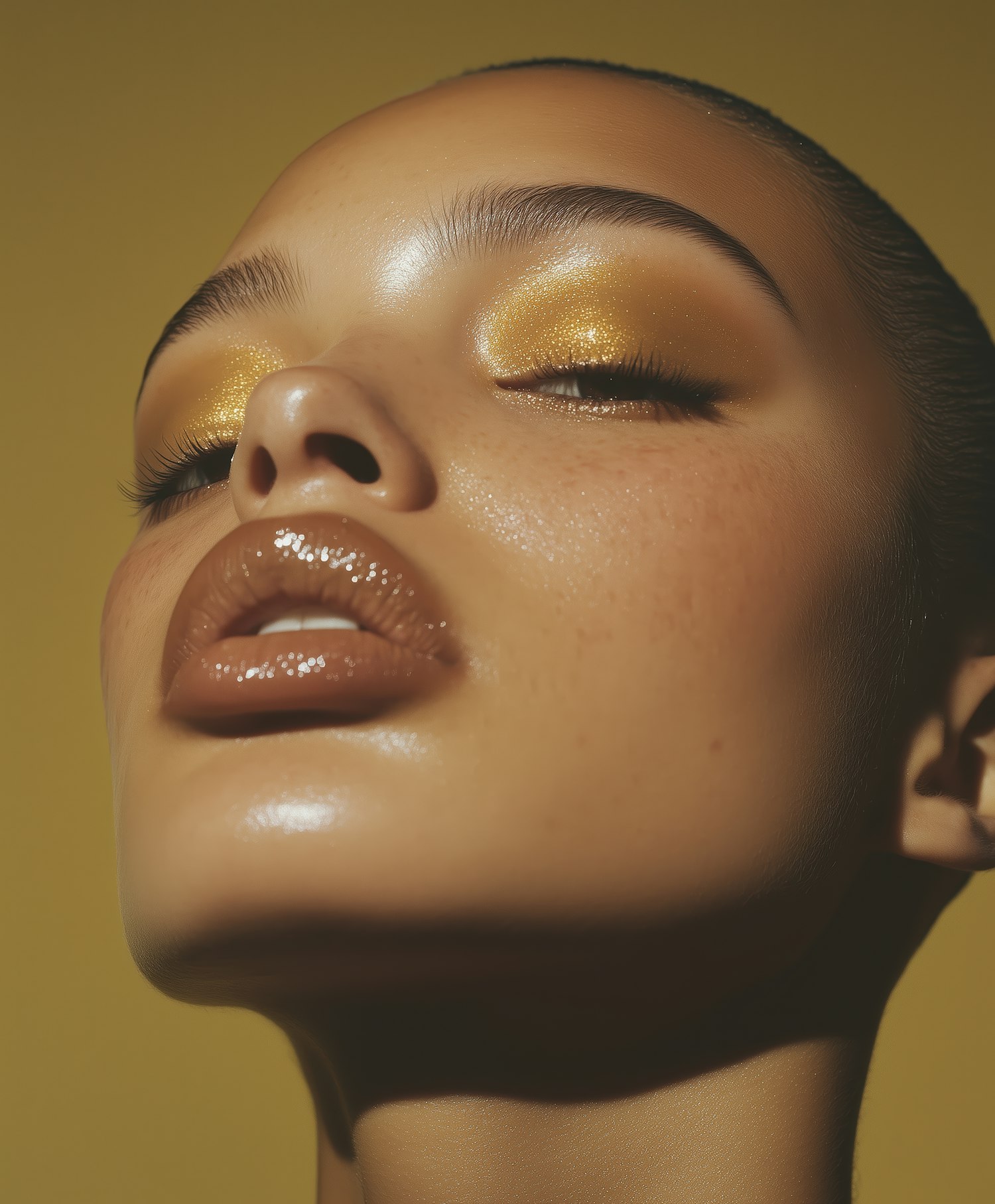 Close-up of a woman with golden glitter eyeshadow, glossy brown lips, and radiant skin against a muted yellow background.