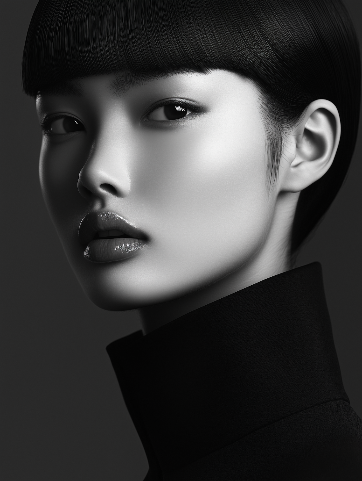 Elegant black and white portrait of an Asian woman with sleek bob and high collar, exuding sophistication and grace.