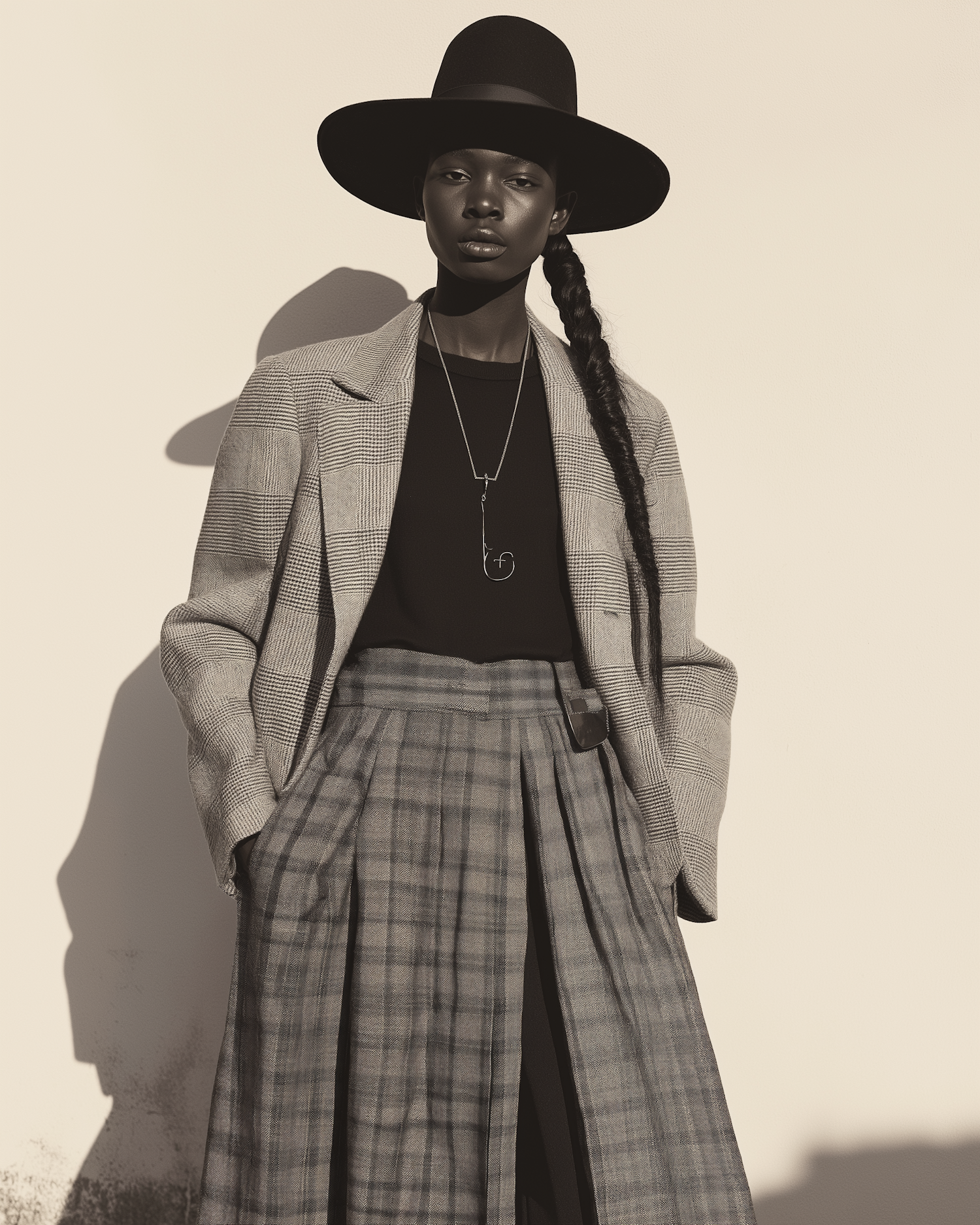Stylish individual in plaid blazer and skirt, wide-brimmed hat, and long braid. Minimalist necklace adds modern touch to classic look.