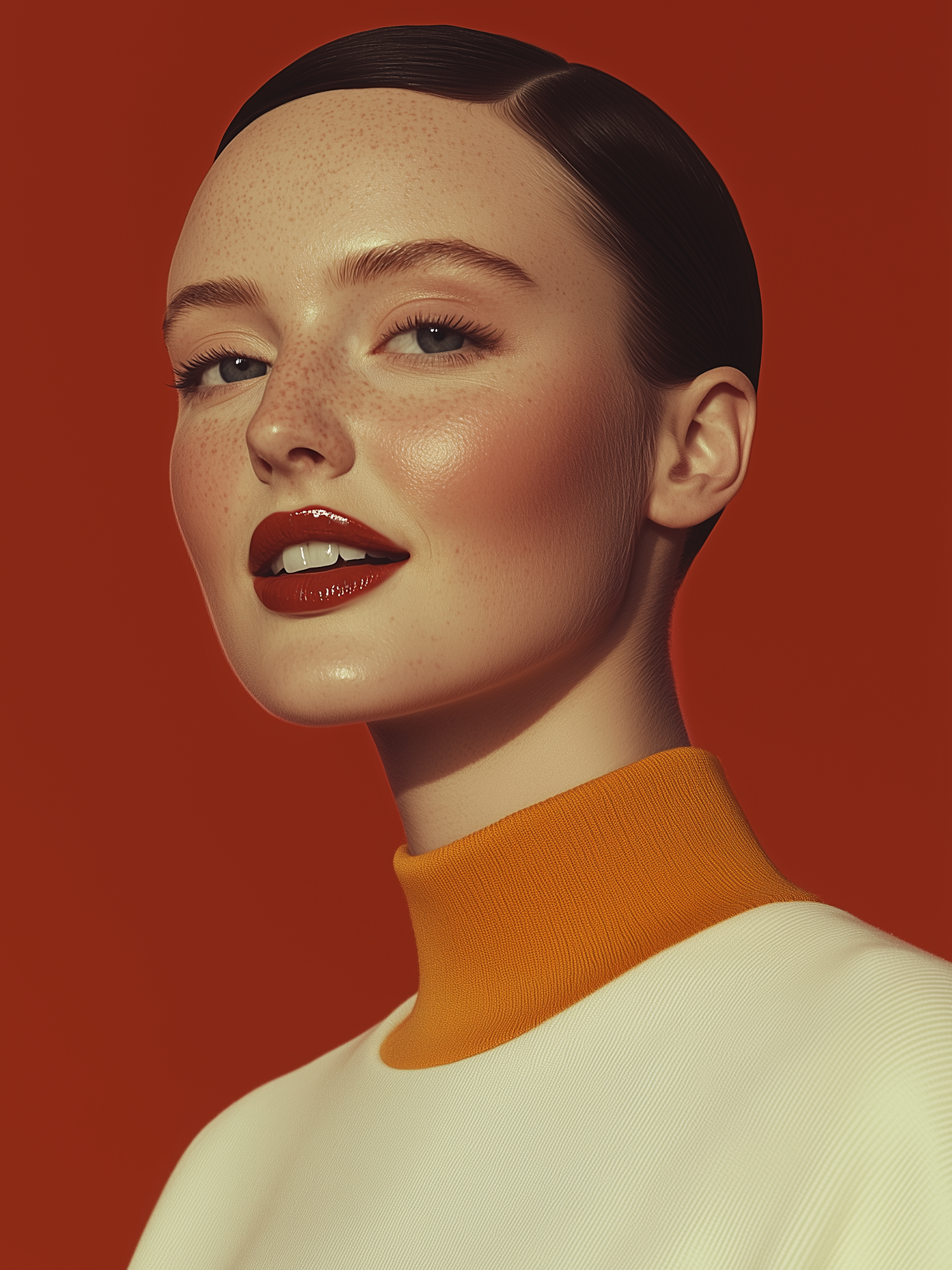 Elegant portrait of a freckled woman with glossy red lips, orange-collared outfit, and sleek hair against a bold orange background.