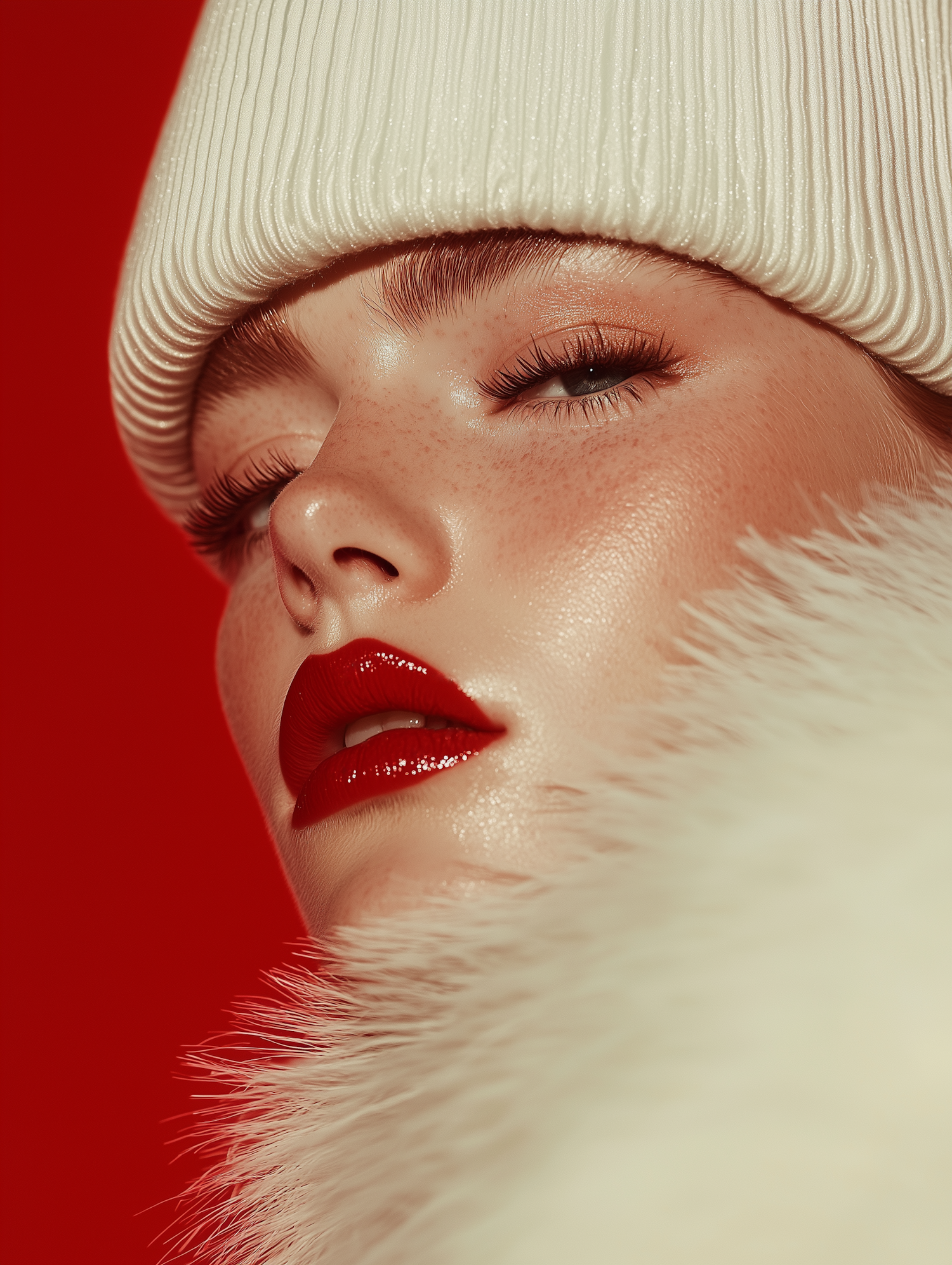 Close-up of a freckled woman in a white beanie and fur, with glossy red lips and green eyes against a bold red background.