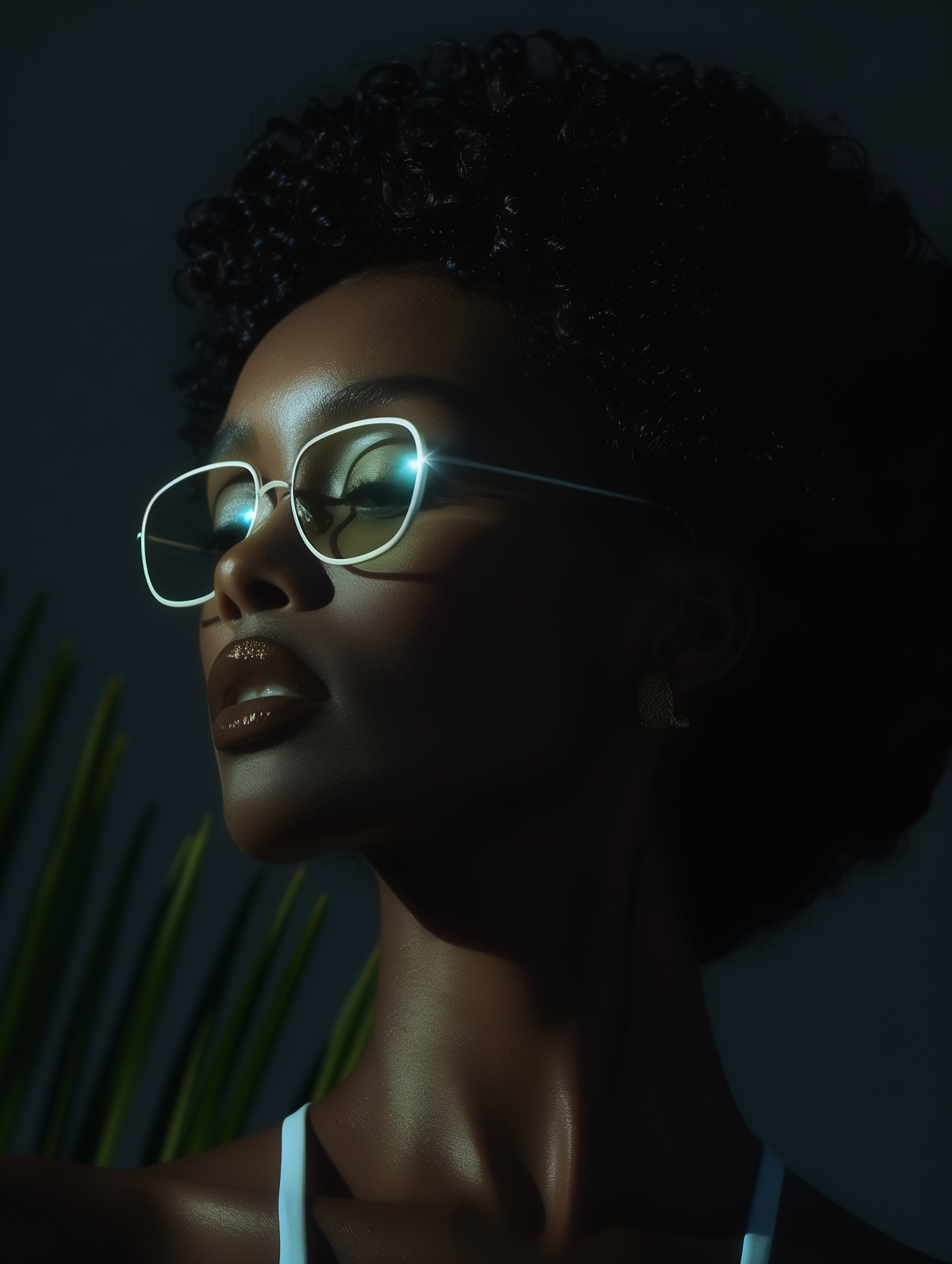 Elegant portrait of a Black woman with reflective glasses, curly hair, and glossy lips, set against a dark background with dramatic lighting.
